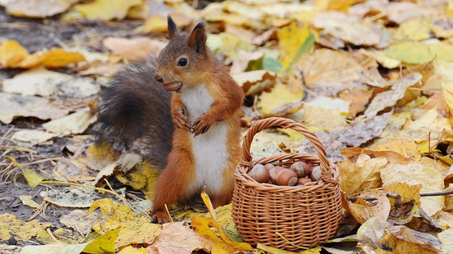 可爱小松鼠秋天摆姿势与坚果篮子松鼠动物免费电脑壁纸下载