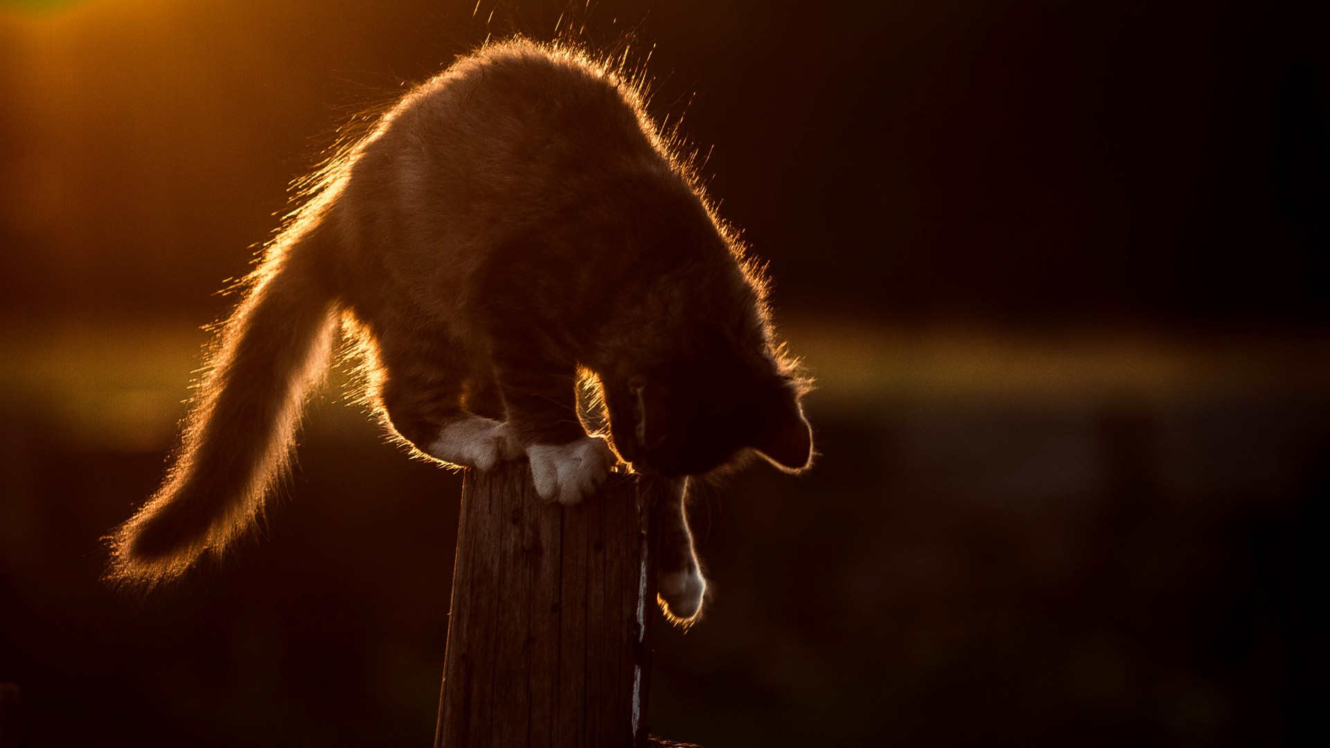 小猫与围栏树桩光主题动物免费电脑桌面壁纸下载