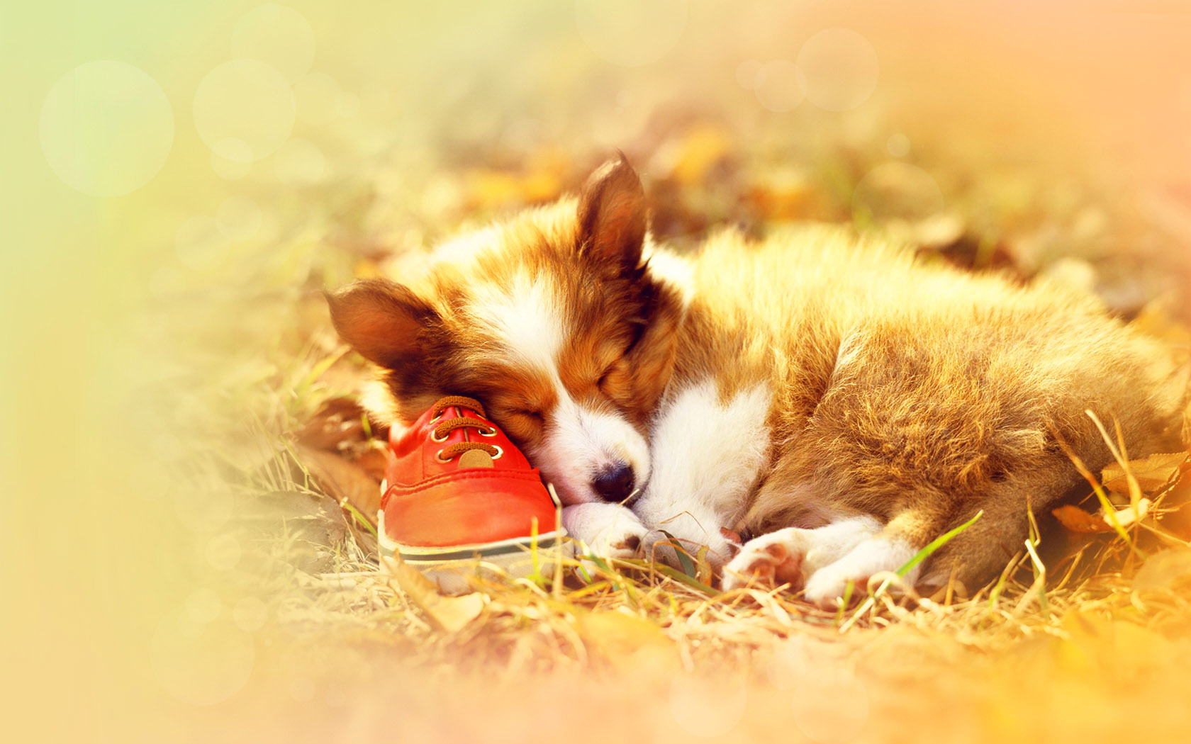 草地上的三只小狗与篮子动物免费电脑壁纸下载