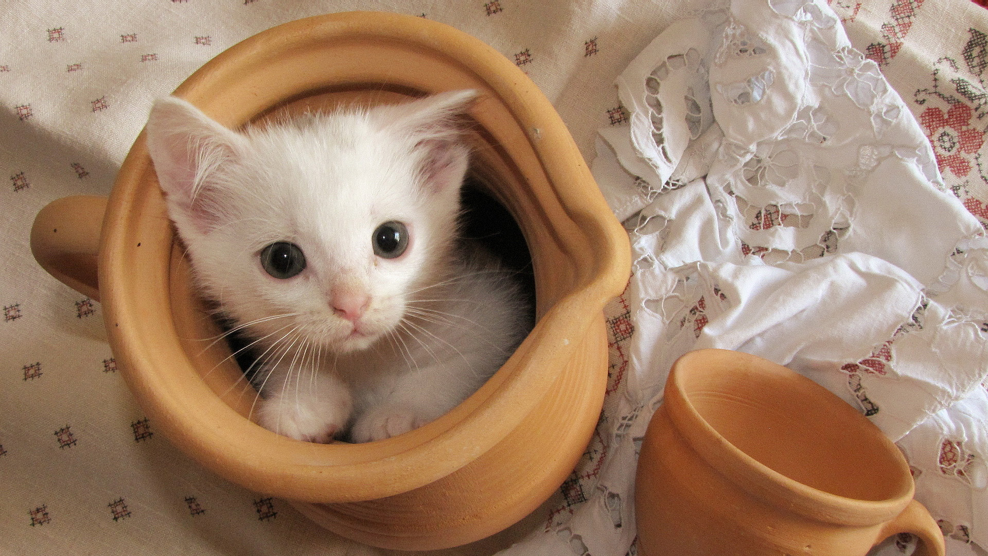可爱小猫与陶瓷罐子动物主题免费电脑桌面壁纸下载