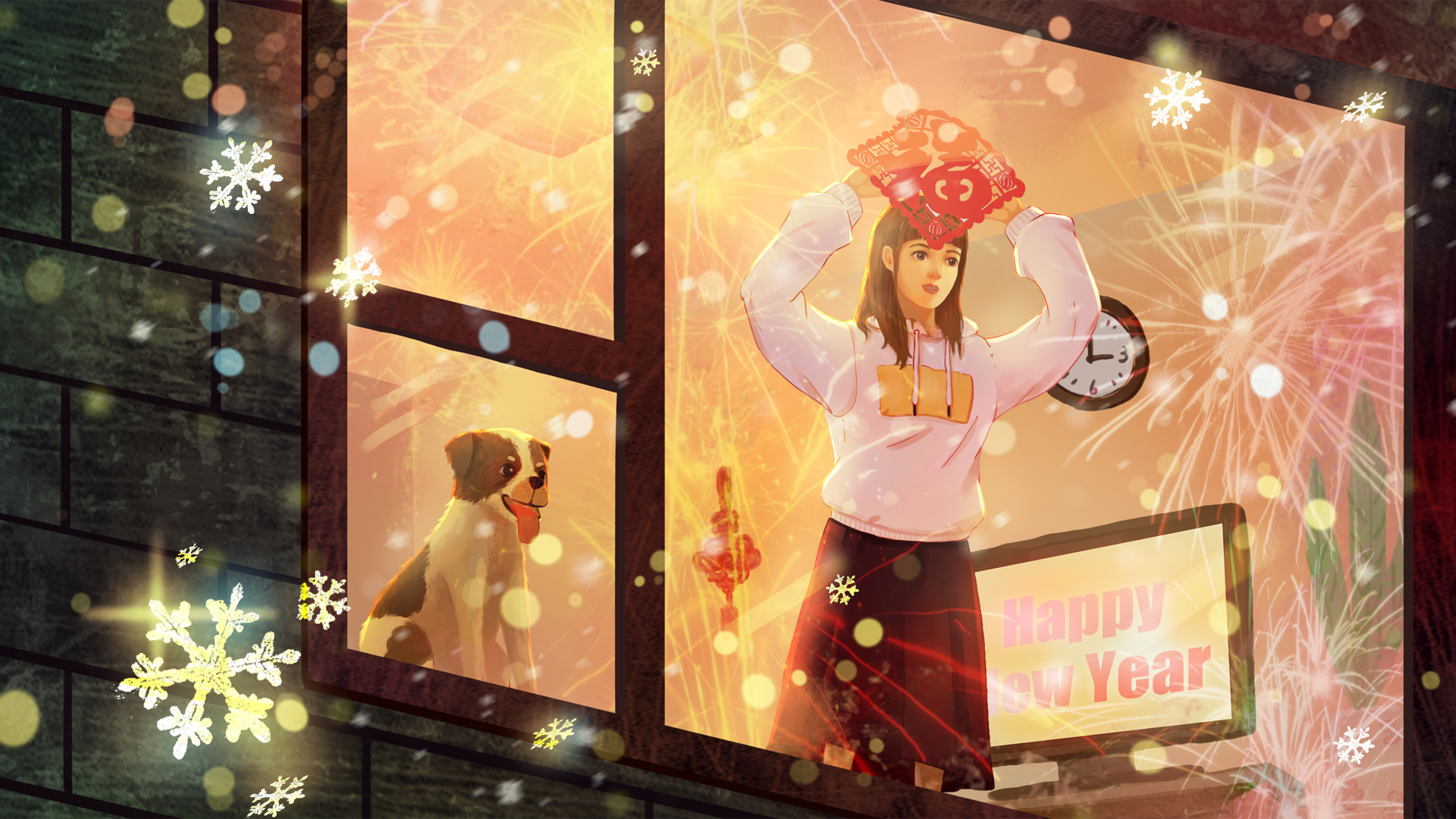 2026新年雪景情侣牵手赏烟花浪漫节日免费电脑壁纸下载