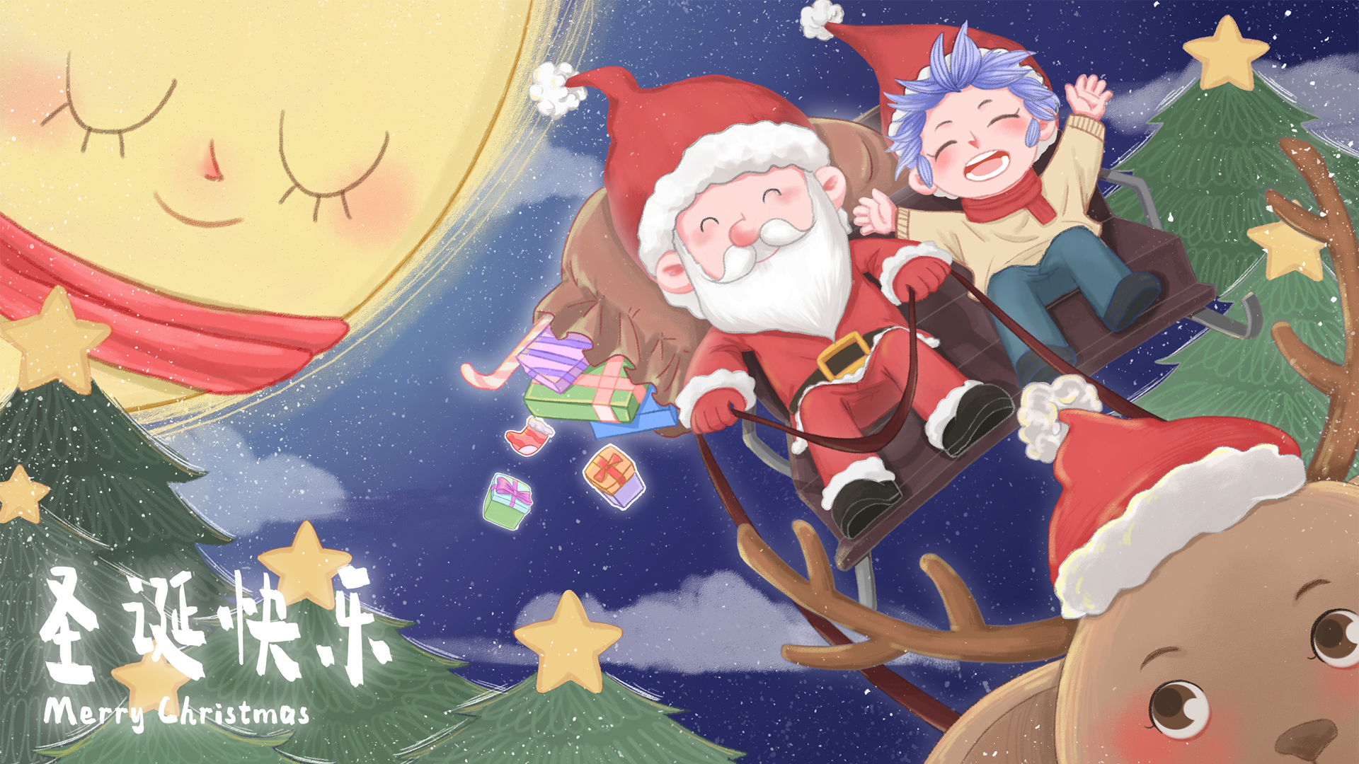 圣诞节平安夜高清手绘壁纸,圣诞老人雪橇圣诞树圣诞鹿免费下载