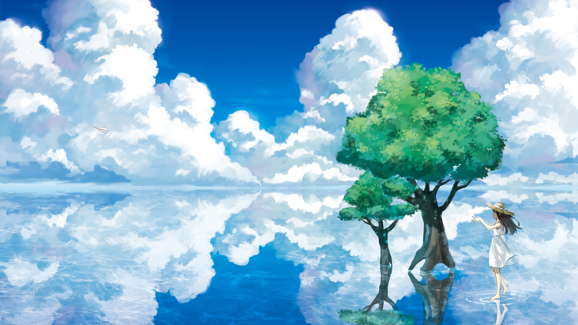 海边水手服女子背影与天空白云动漫风景免费电脑壁纸下载