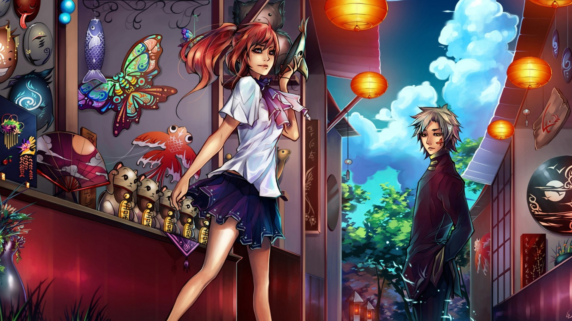 女子高中生校服制服与高楼气球音乐元素浮起来动漫免费电脑壁纸下载