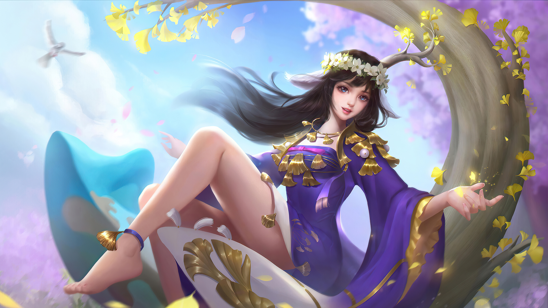 坐在树上的女孩花环唯美动漫电脑壁纸免费下载