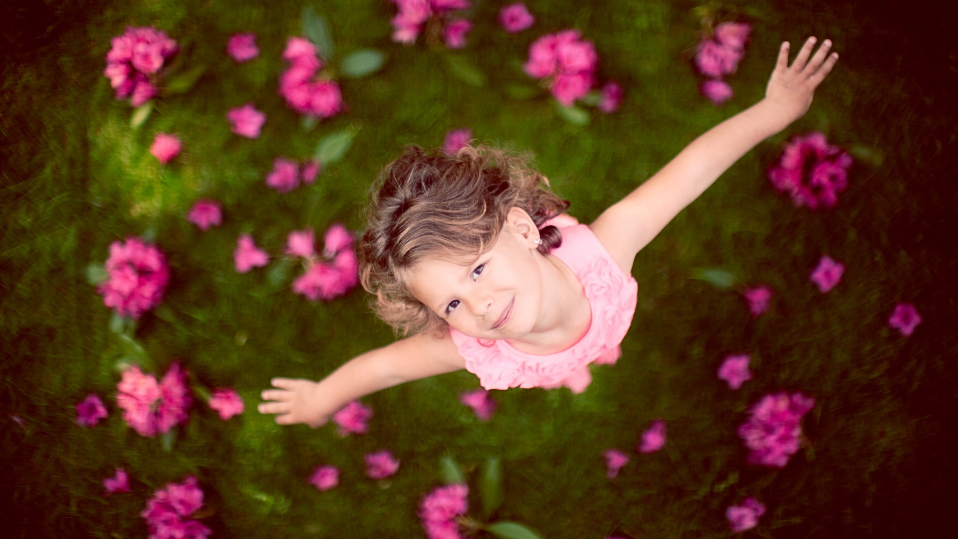 女孩孩子草地仰望放飞心情鲜花主题免费电脑壁纸下载
