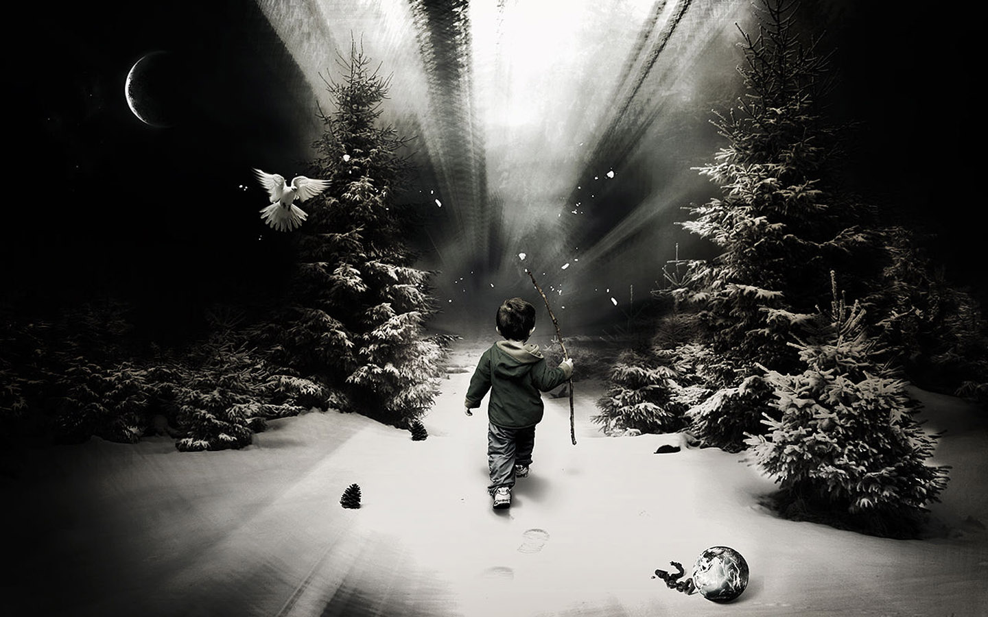 小女孩小男孩路与行星太空主题免费电脑桌面壁纸下载