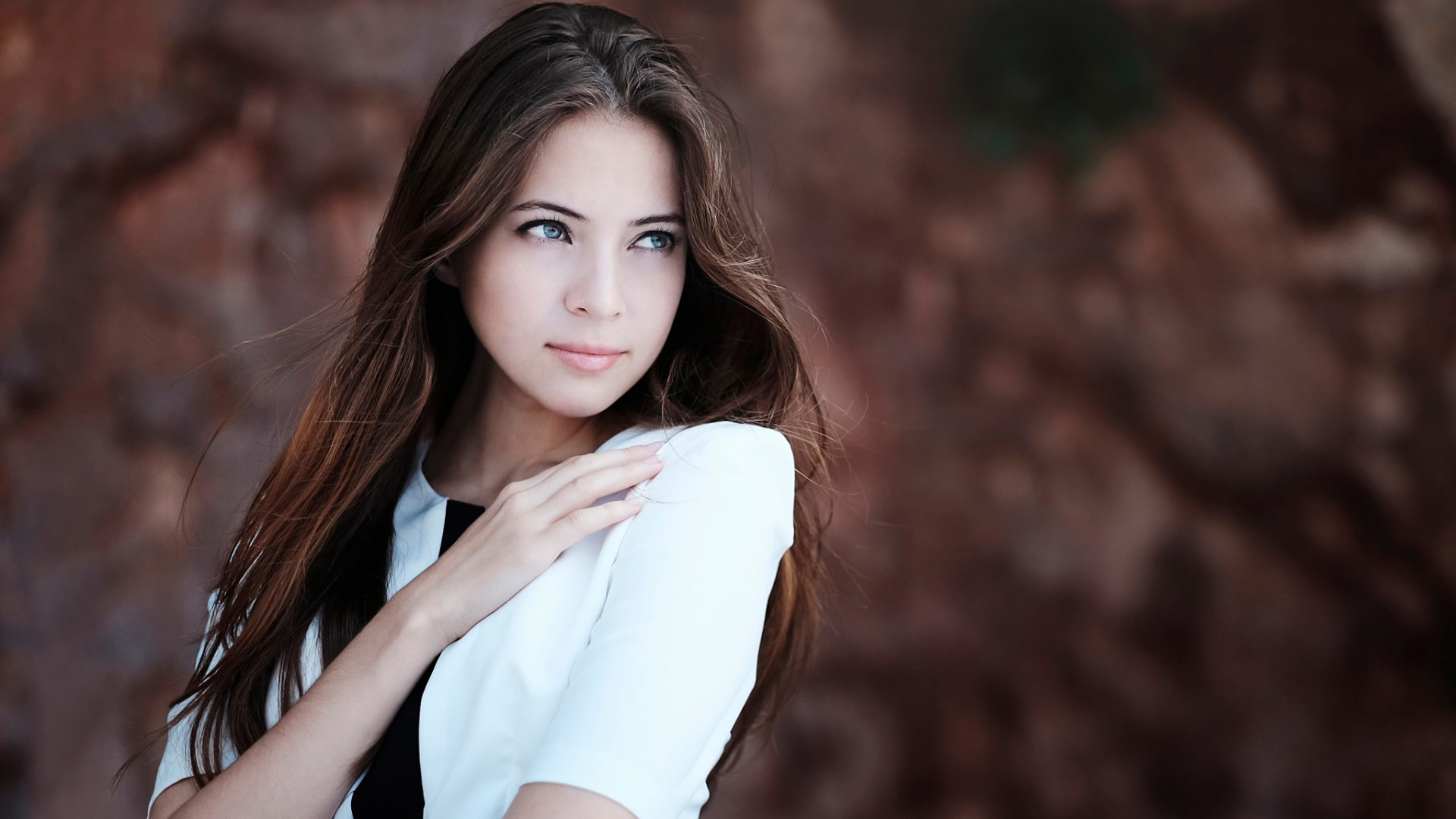 漂亮女孩长头发白色礼服眼神动人美女写真免费电脑壁纸下载