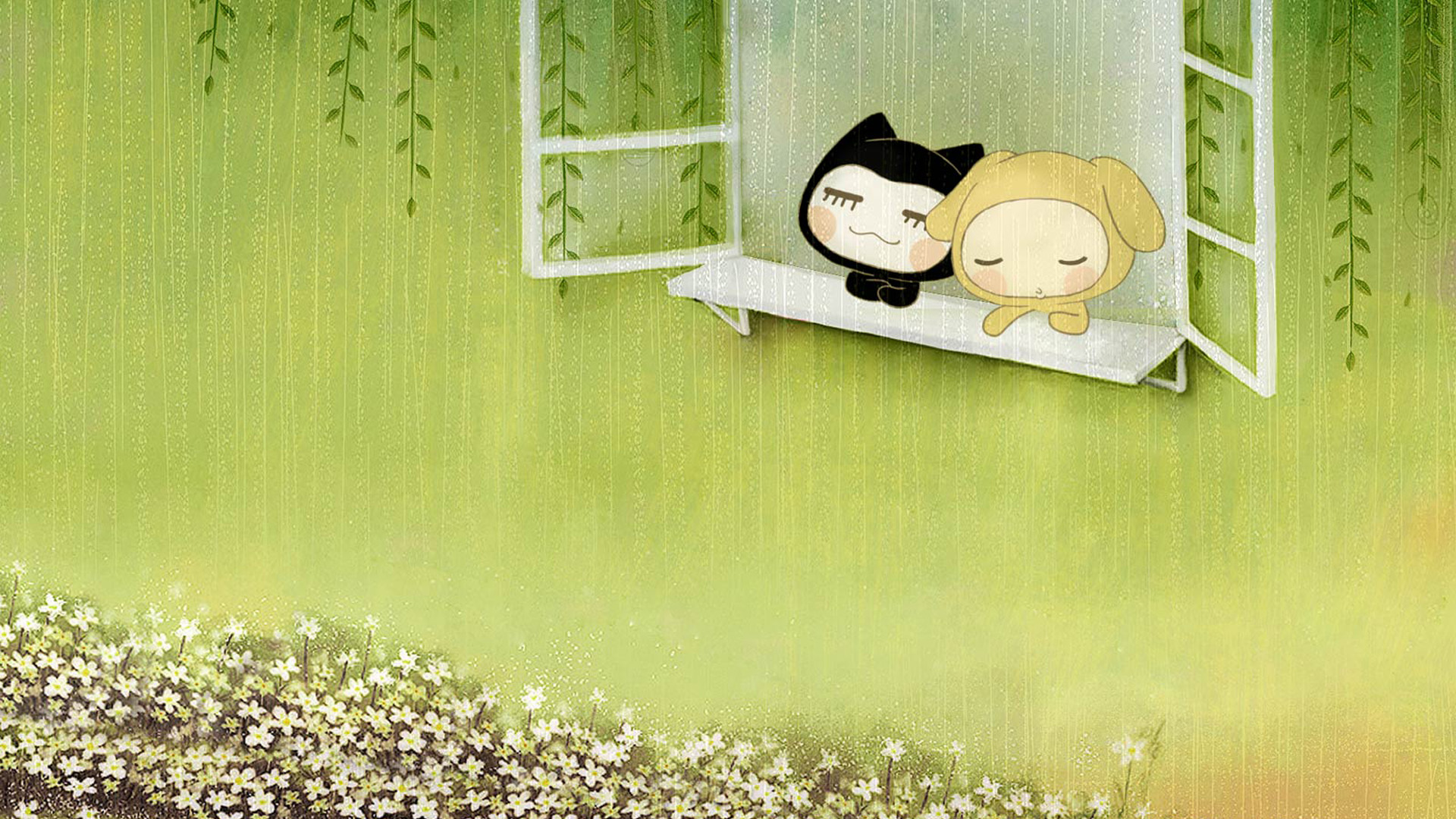 动漫美少女女孩在水边房子旁乘凉电脑壁纸免费下载