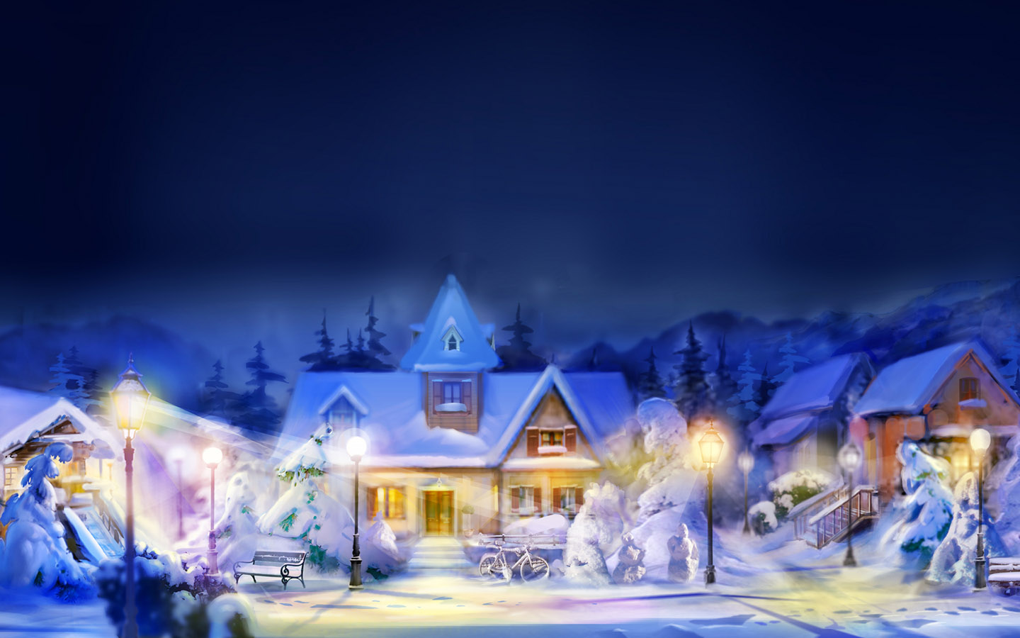 圣诞节冬天云杉雪小屋灯光风景免费电脑壁纸下载