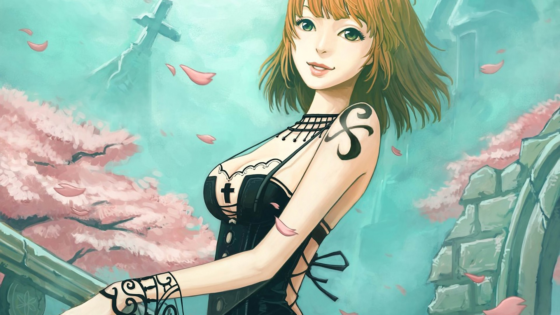 报纸墙背景长发漂亮美女动漫免费电脑壁纸下载