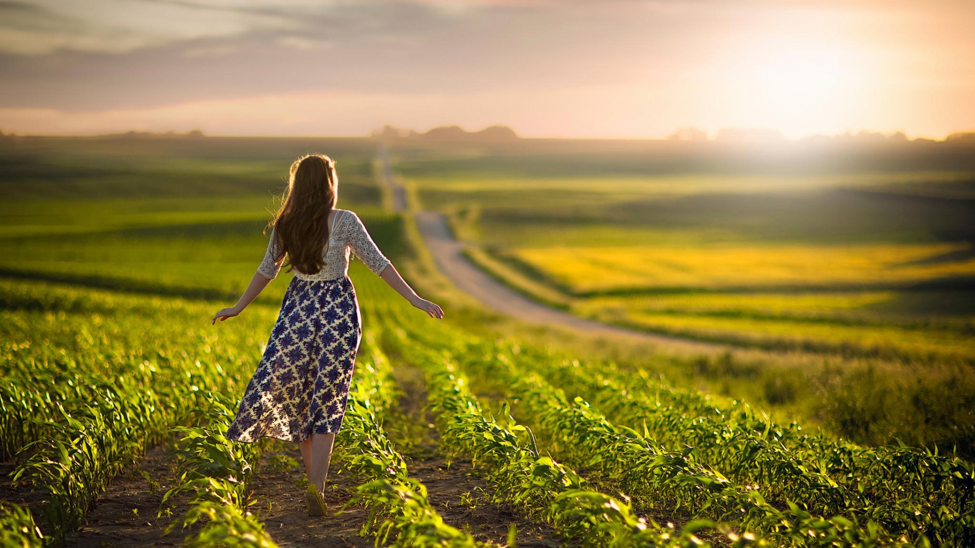 早上桥边卷发女孩穿白色裙子唯美电脑壁纸免费下载