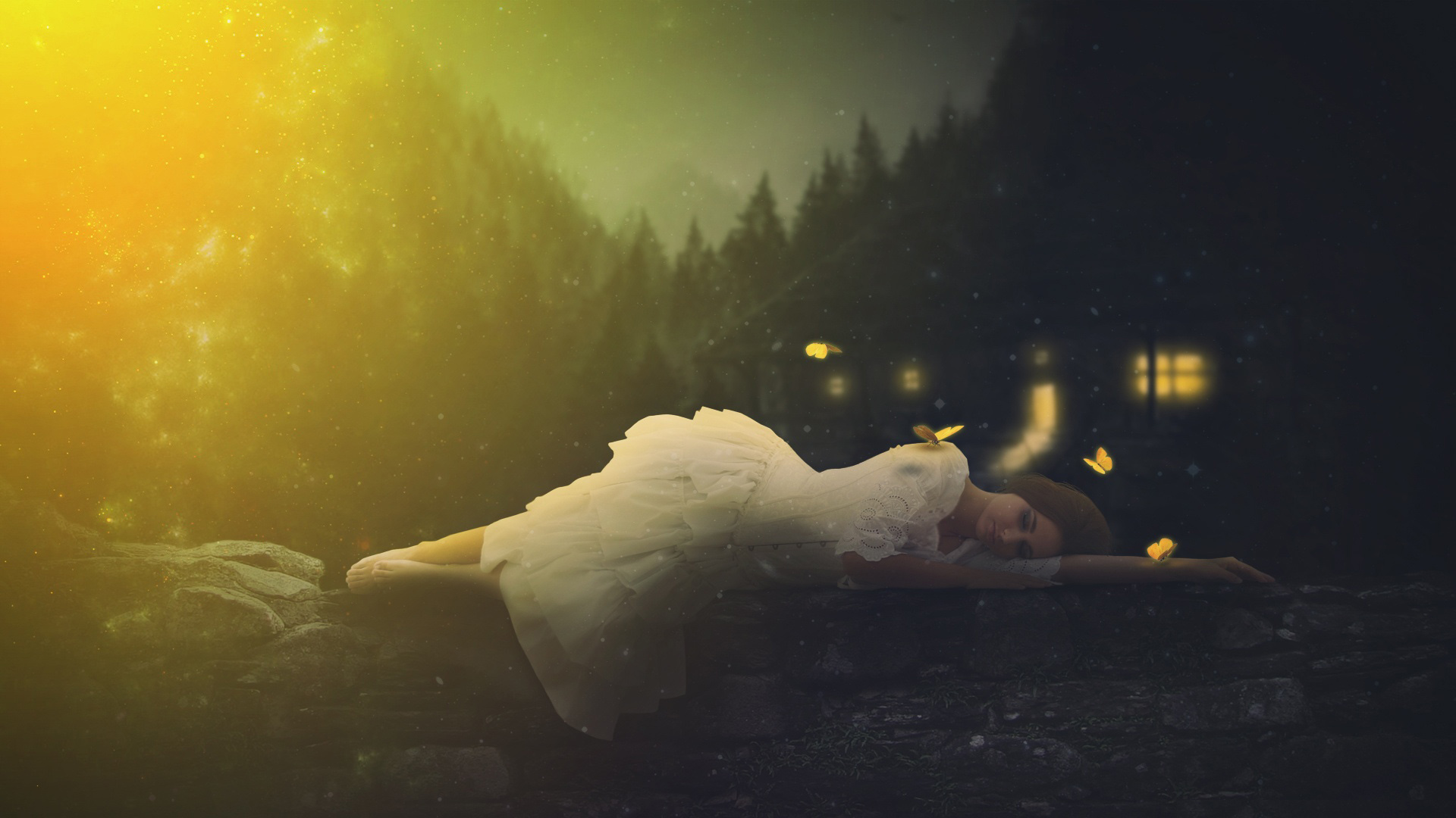 托马斯绘画夜晚森林小屋溪水小桥月亮星星唯美意境免费电脑壁纸下载
