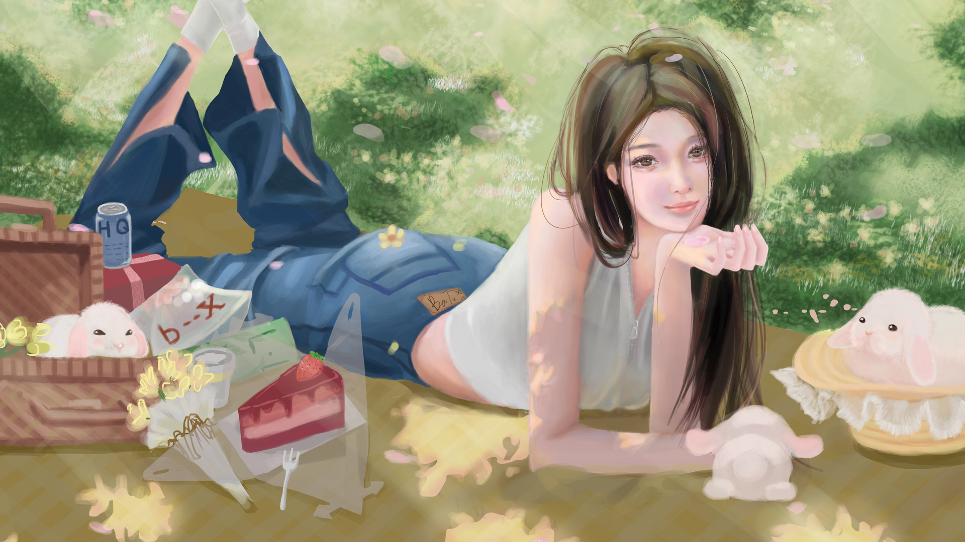 唯美动漫壁纸,女孩子与花的插画免费电脑壁纸下载