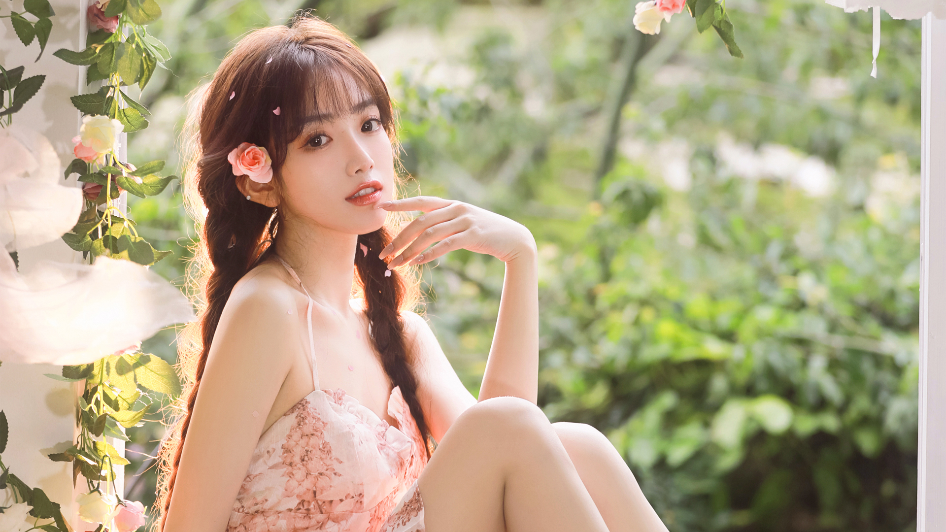 花园芭蕾背景下的靓丽美女高清桌面壁纸免费下载