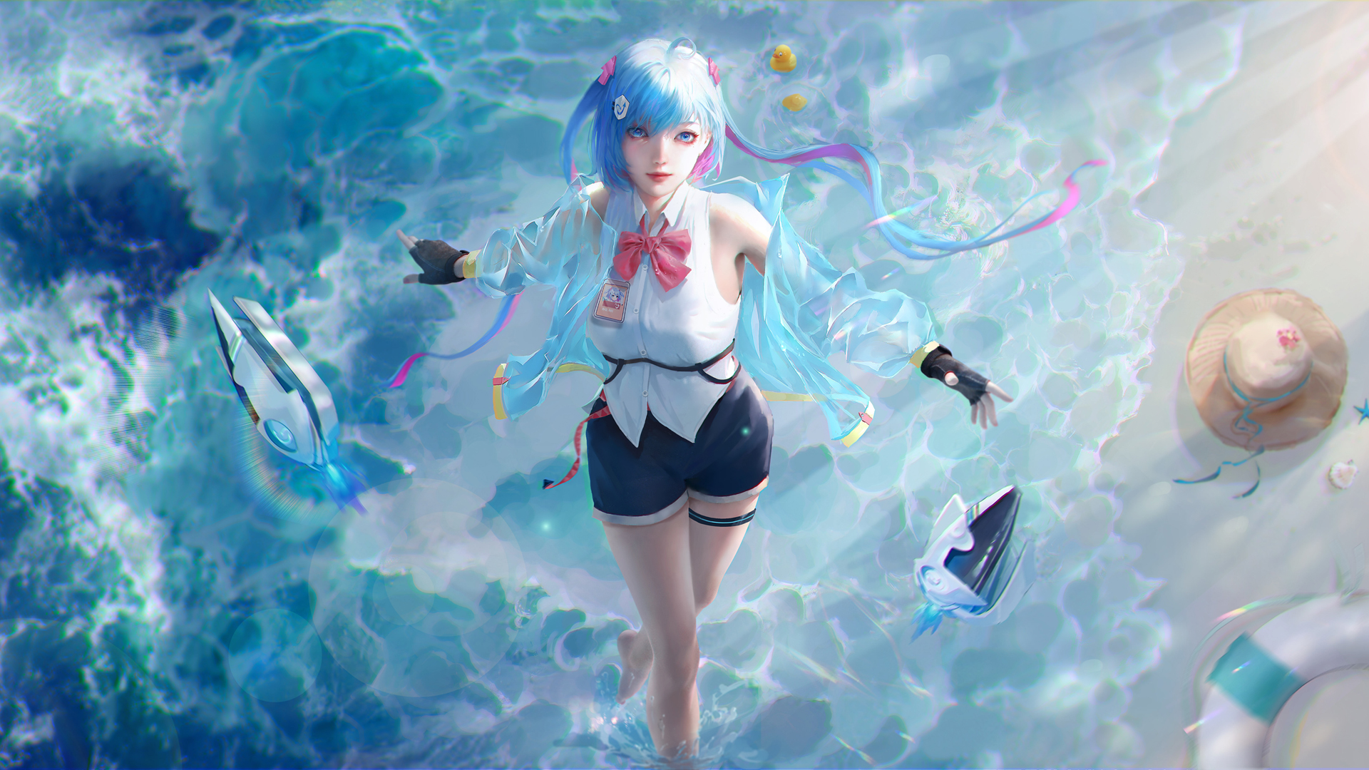海滩厚涂风动漫壁纸,少女短裤治愈系免费电脑壁纸下载