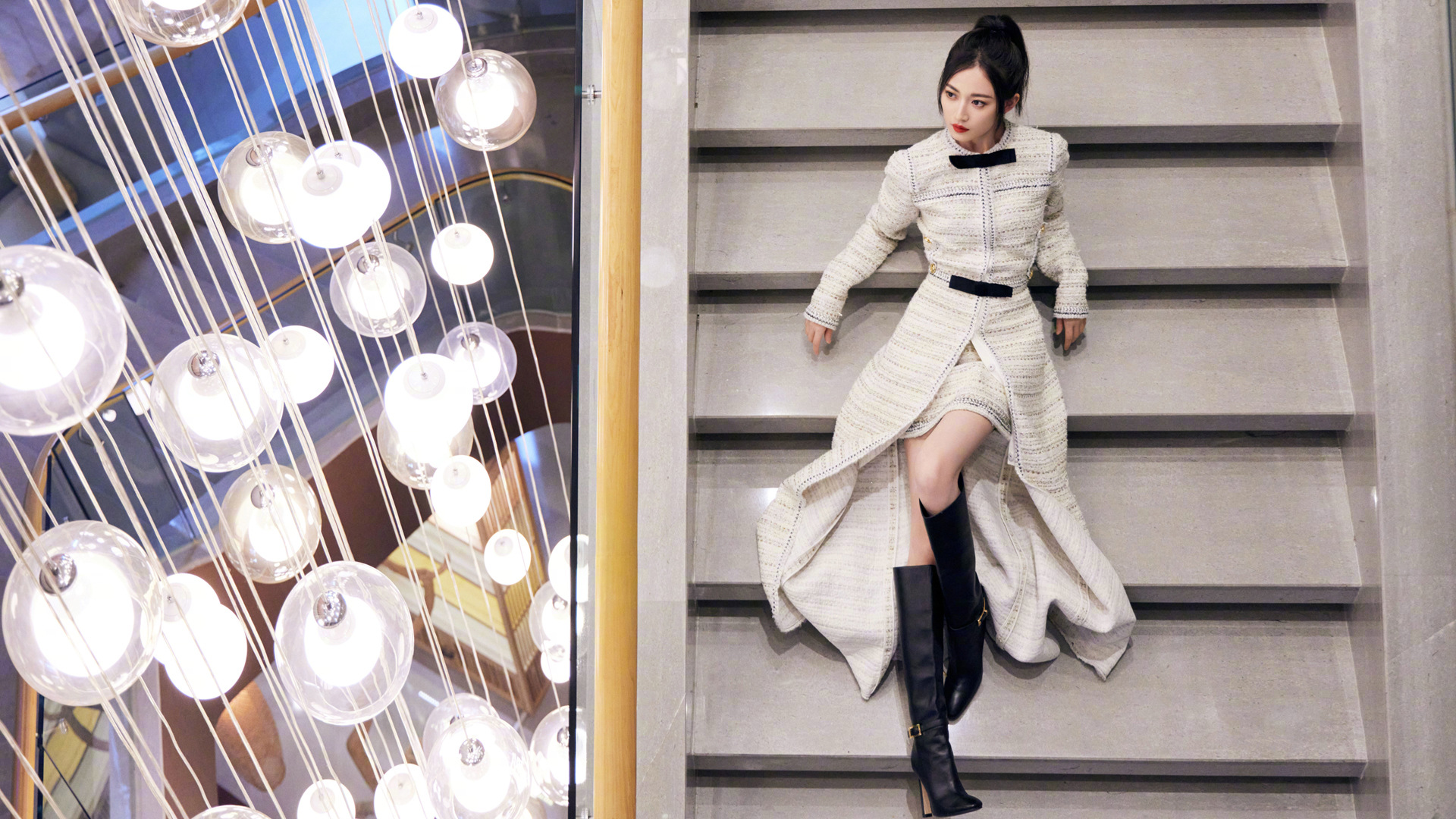 陈钰琪大衣裙配黑色长靴楼梯间美女壁纸 免费电脑壁纸下载