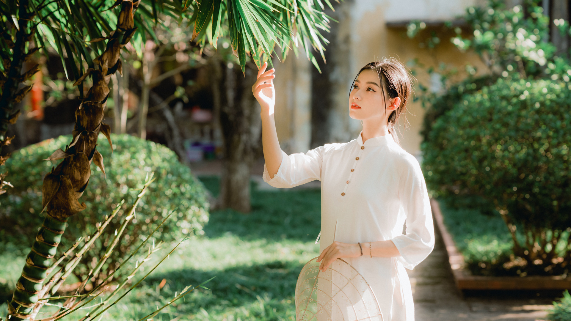 白色衣服戴斗笠美女与竹叶风景壁纸免费电脑下载