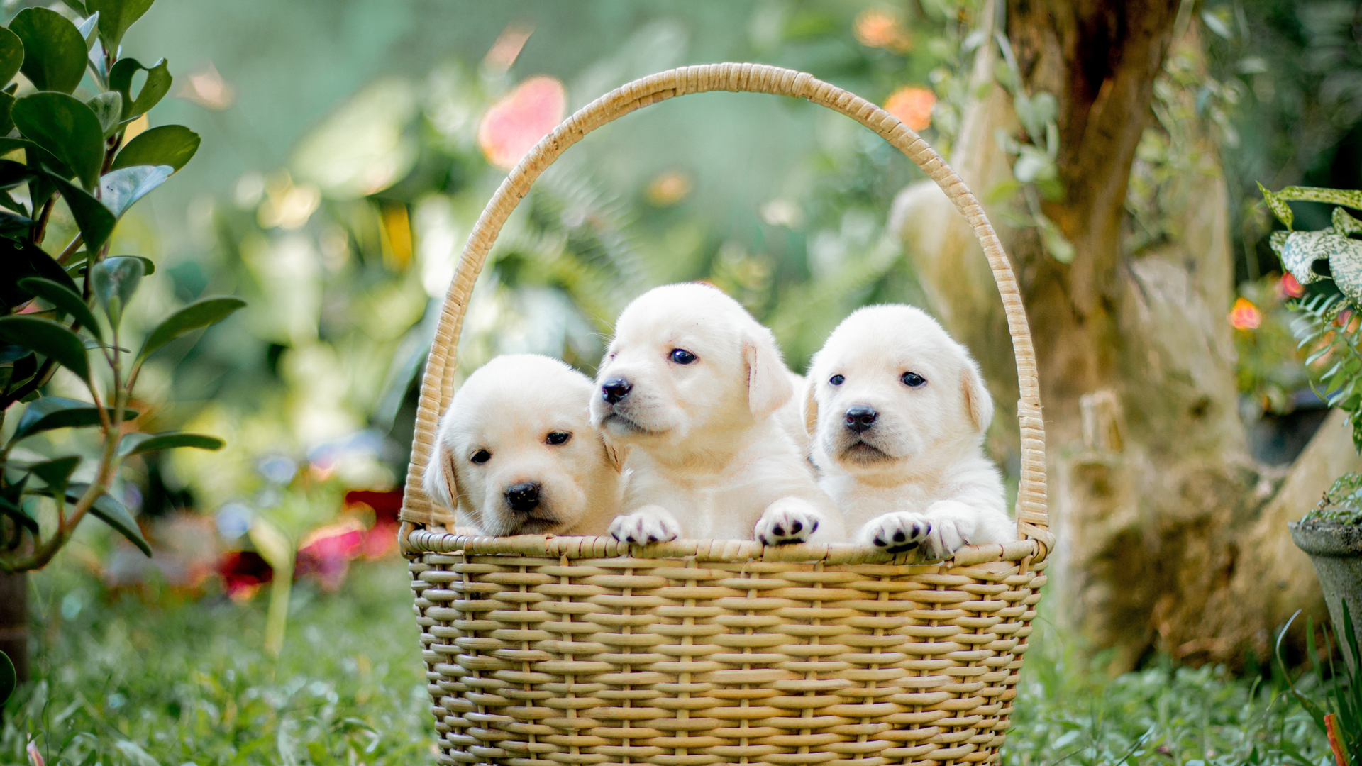 三只可爱浣熊在树旁家的免费电脑动物桌面壁纸下载