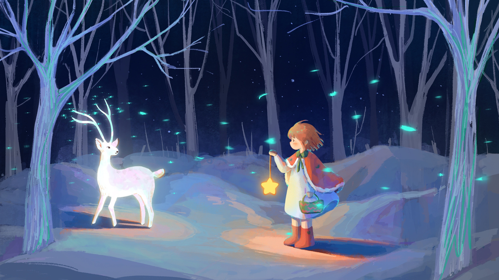 梦幻森林仙境天堂,和平女孩与鹿蘑菇唯美意境免费电脑壁纸下载