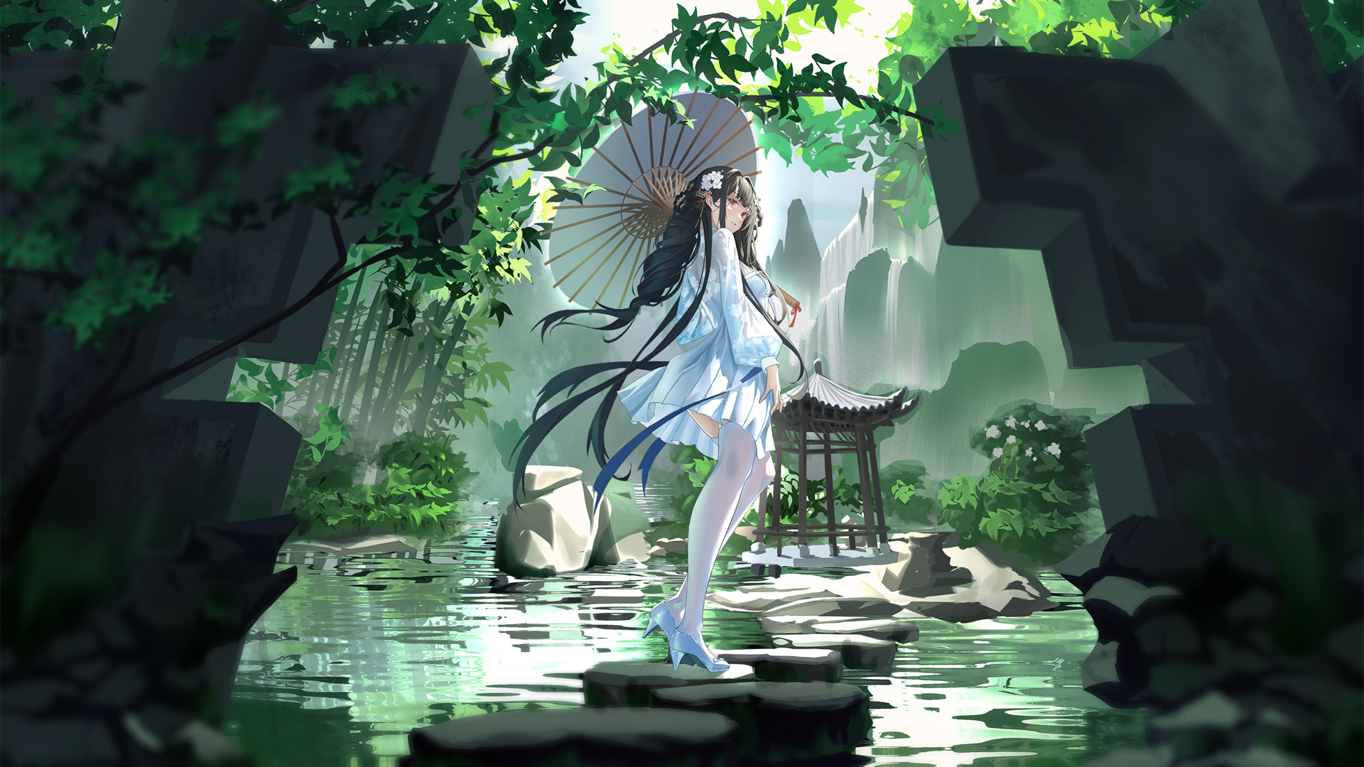 女孩 连衣裙 伞 树叶 瀑布 动漫高清壁纸