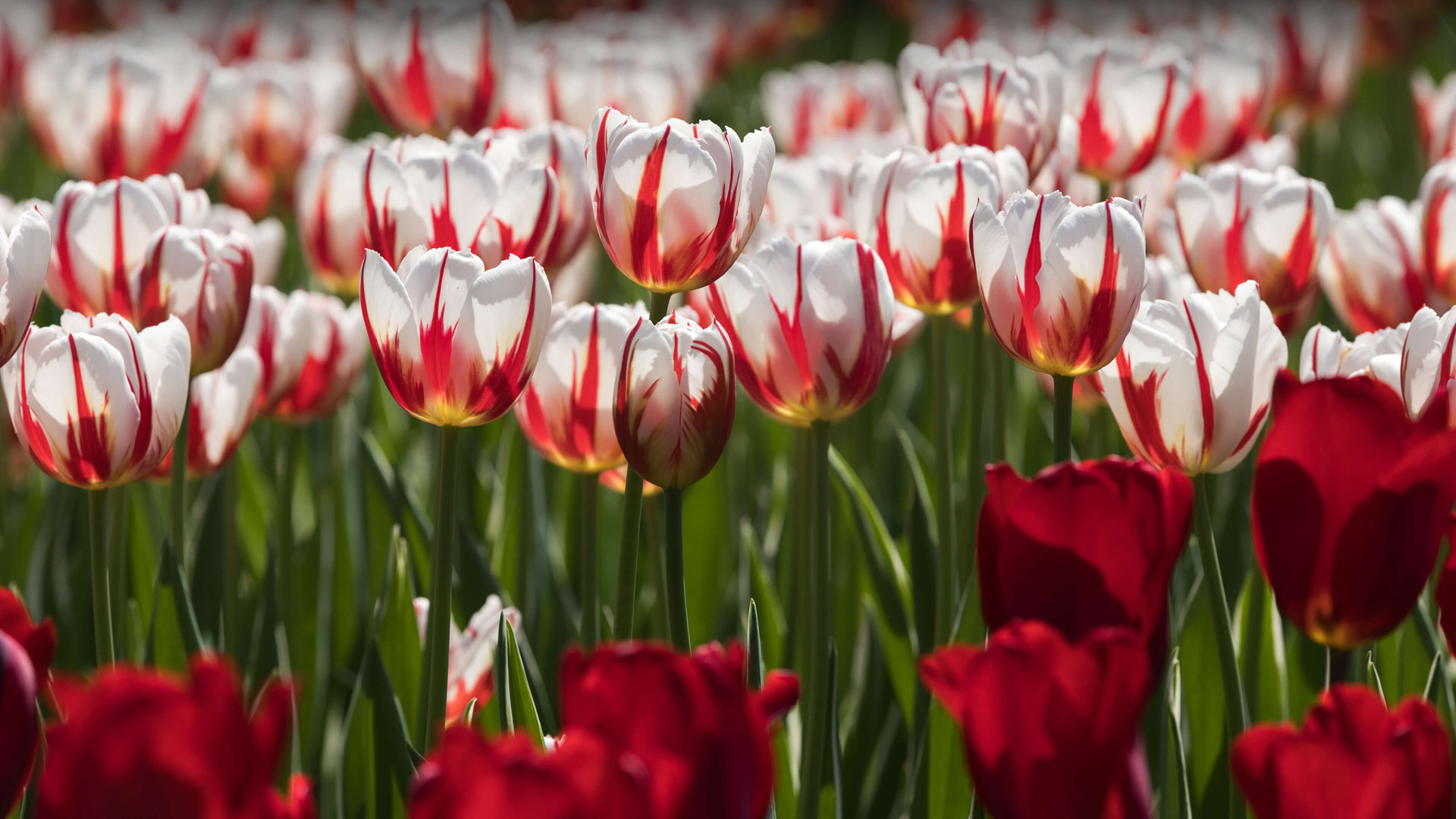 红白色郁金香花卉高清免费电脑桌面壁纸下载