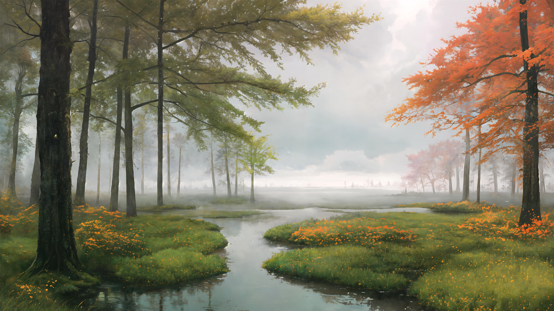 AI绘画自然风景,森林河流树木鲜花电脑壁纸免费下载