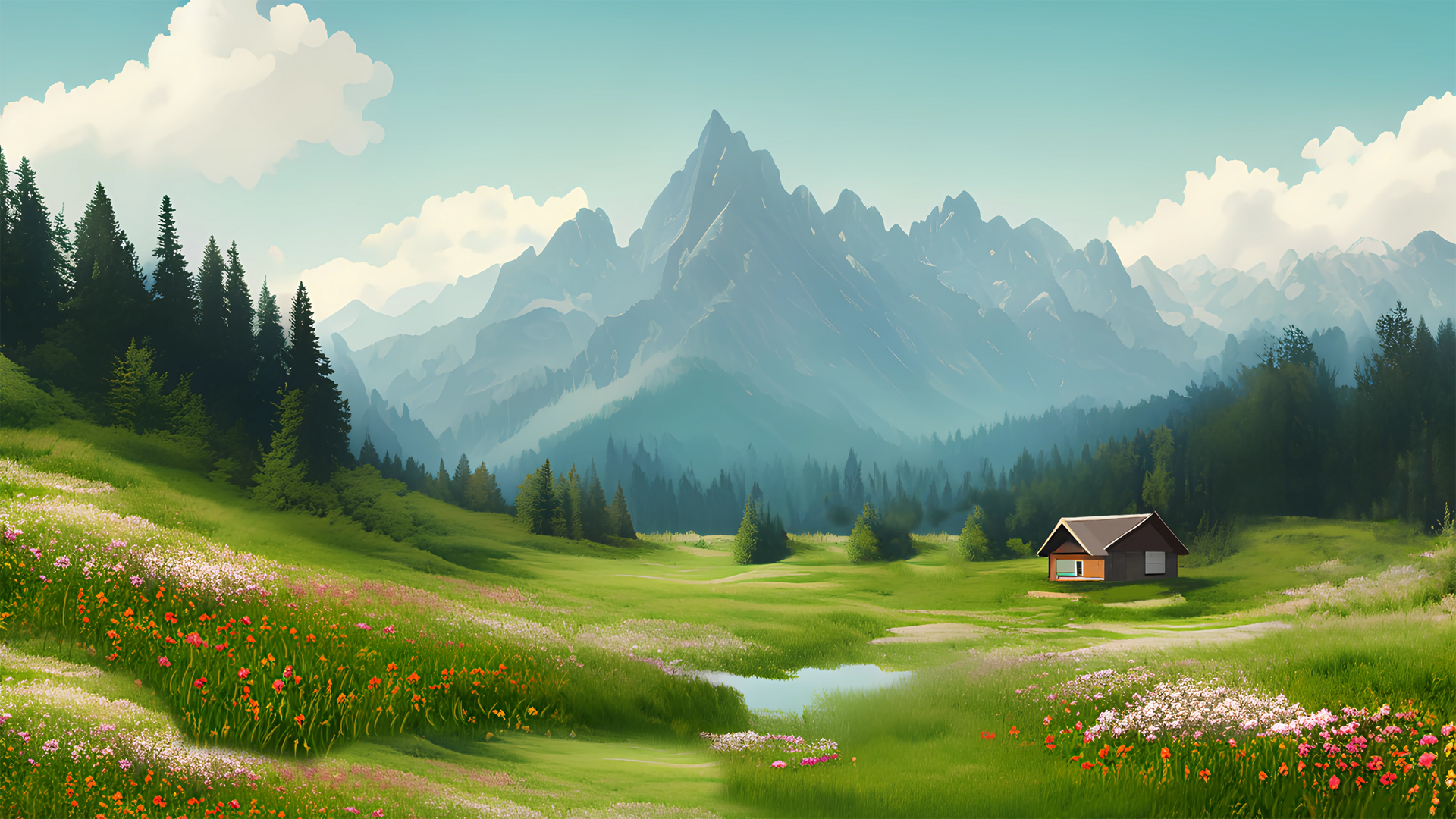 AI风景阿尔卑斯山树林小房子绿草地鲜花护眼电脑壁纸免费下载