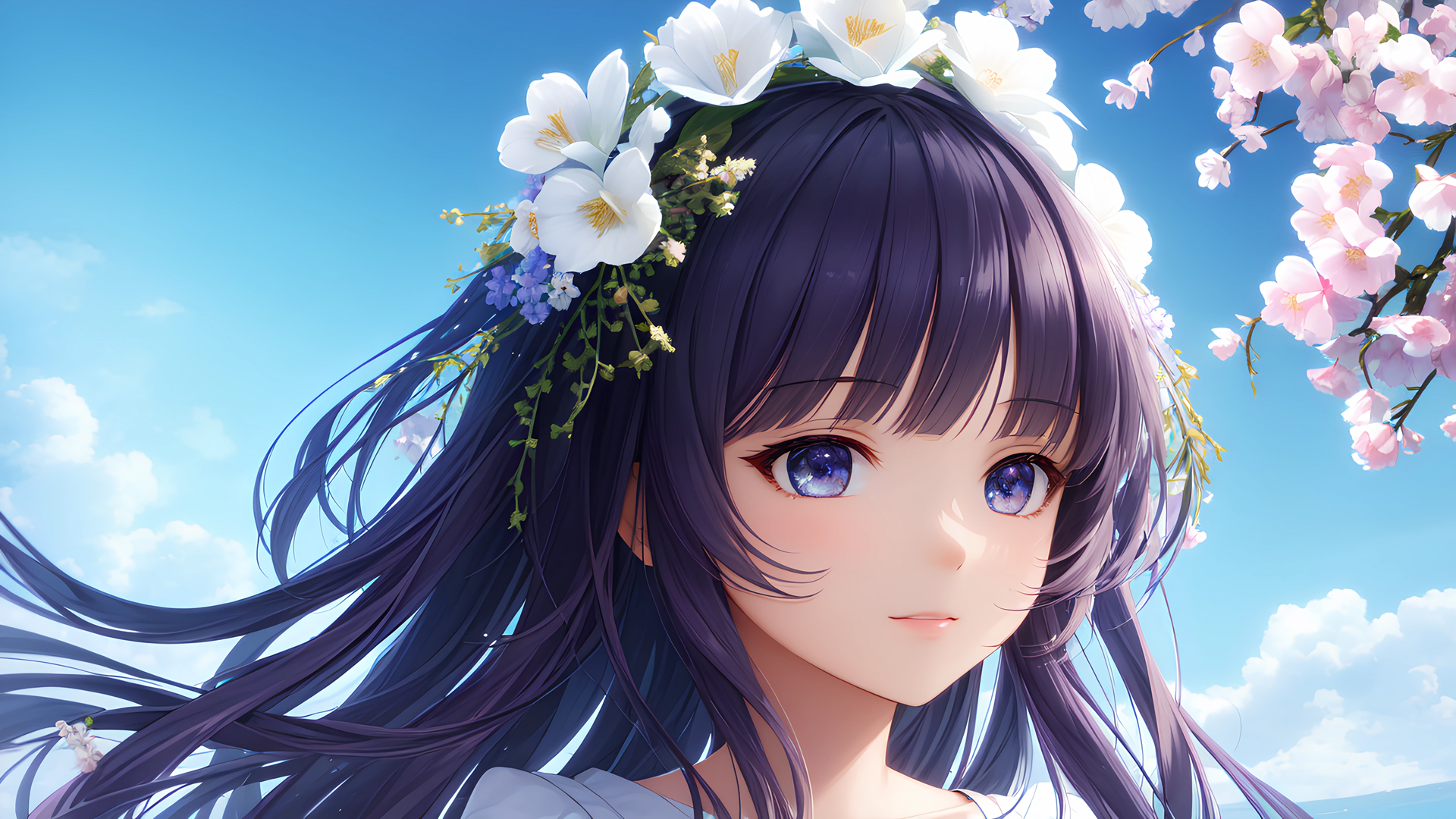 长发动漫少女与鲜花蓝天主题动漫女孩免费电脑壁纸下载