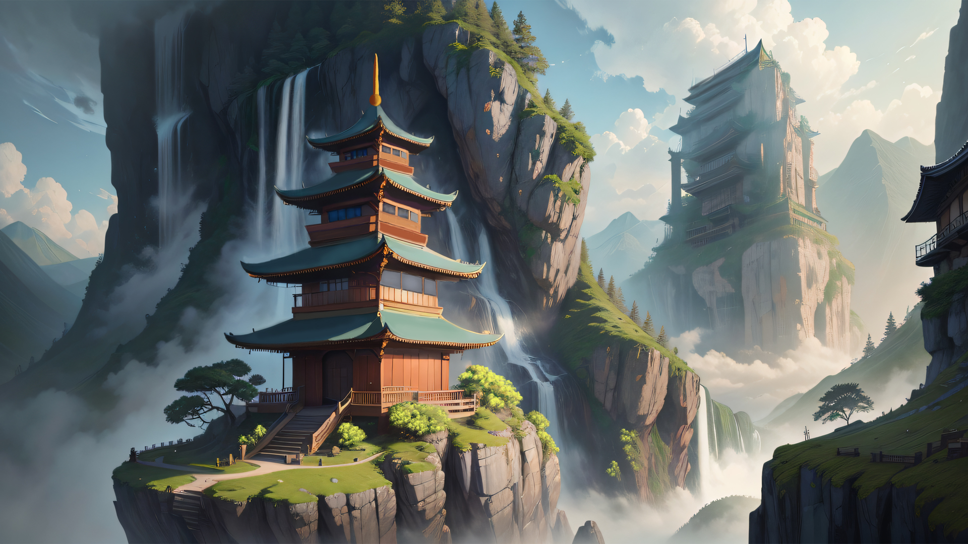 高山瀑布流水塔寺院树云天空唯美仙境风景原创壁纸免费下载