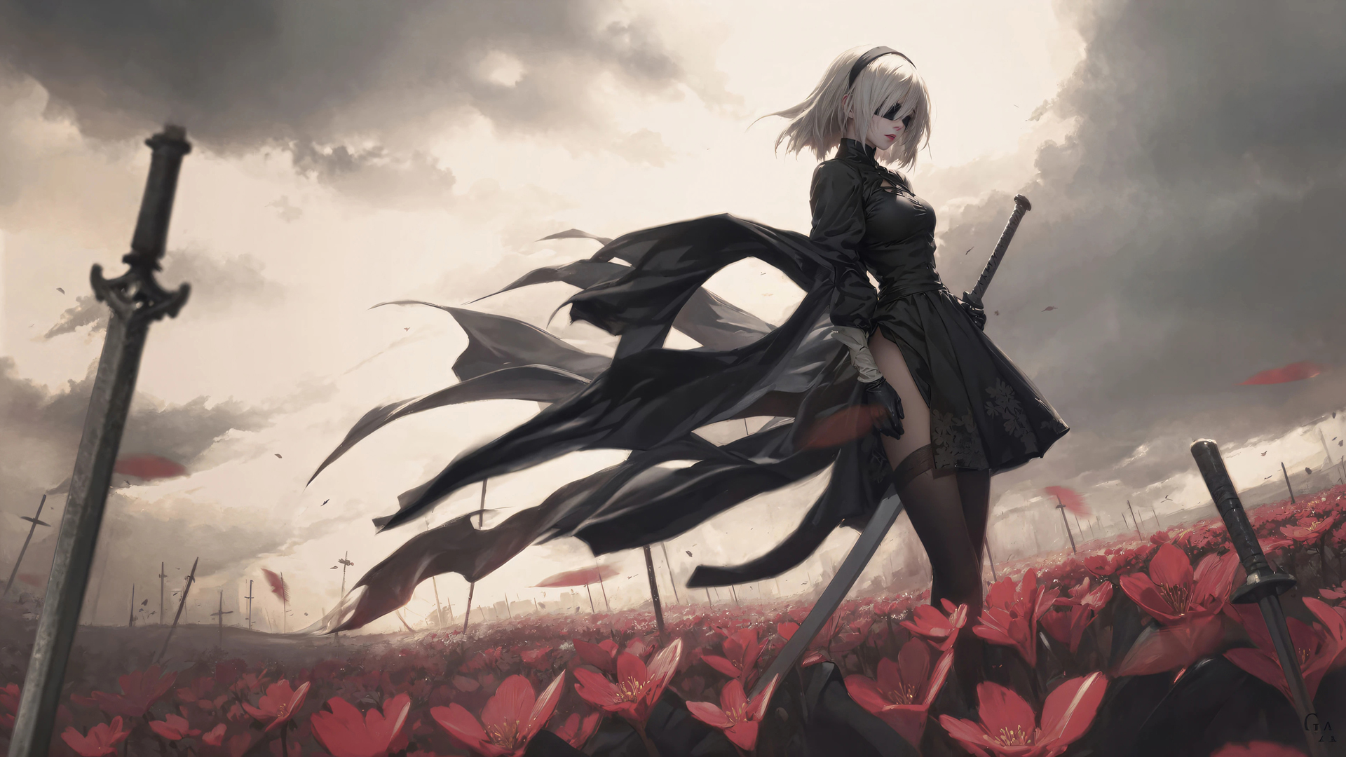 尼尔机械纪元2B黑色裙子 剑 红色花朵 游戏美女壁纸