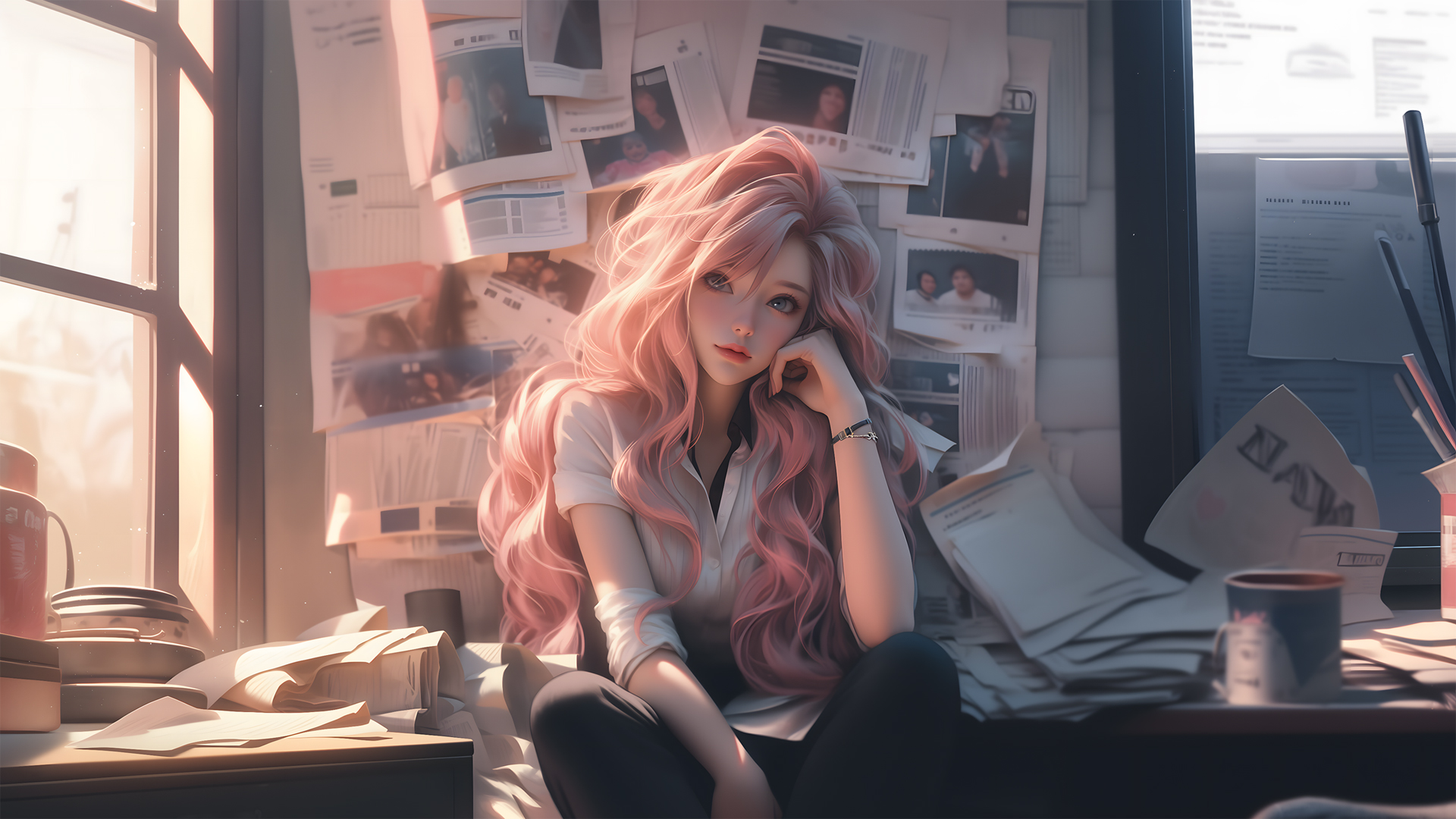 报纸墙背景下的白色长发美女动漫免费电脑壁纸下载