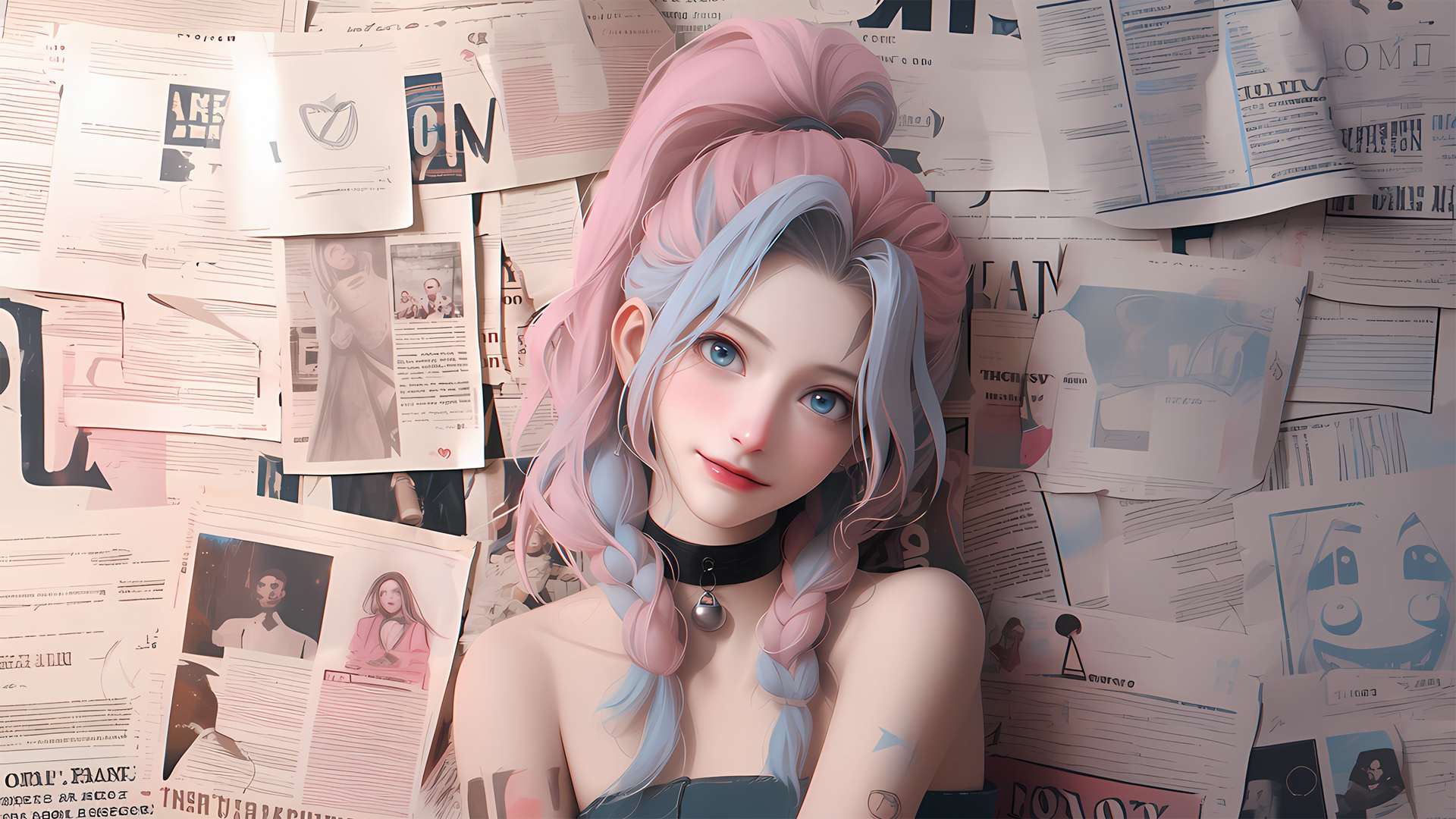 报纸墙少女金克丝粉色马尾辫子动漫免费电脑壁纸下载