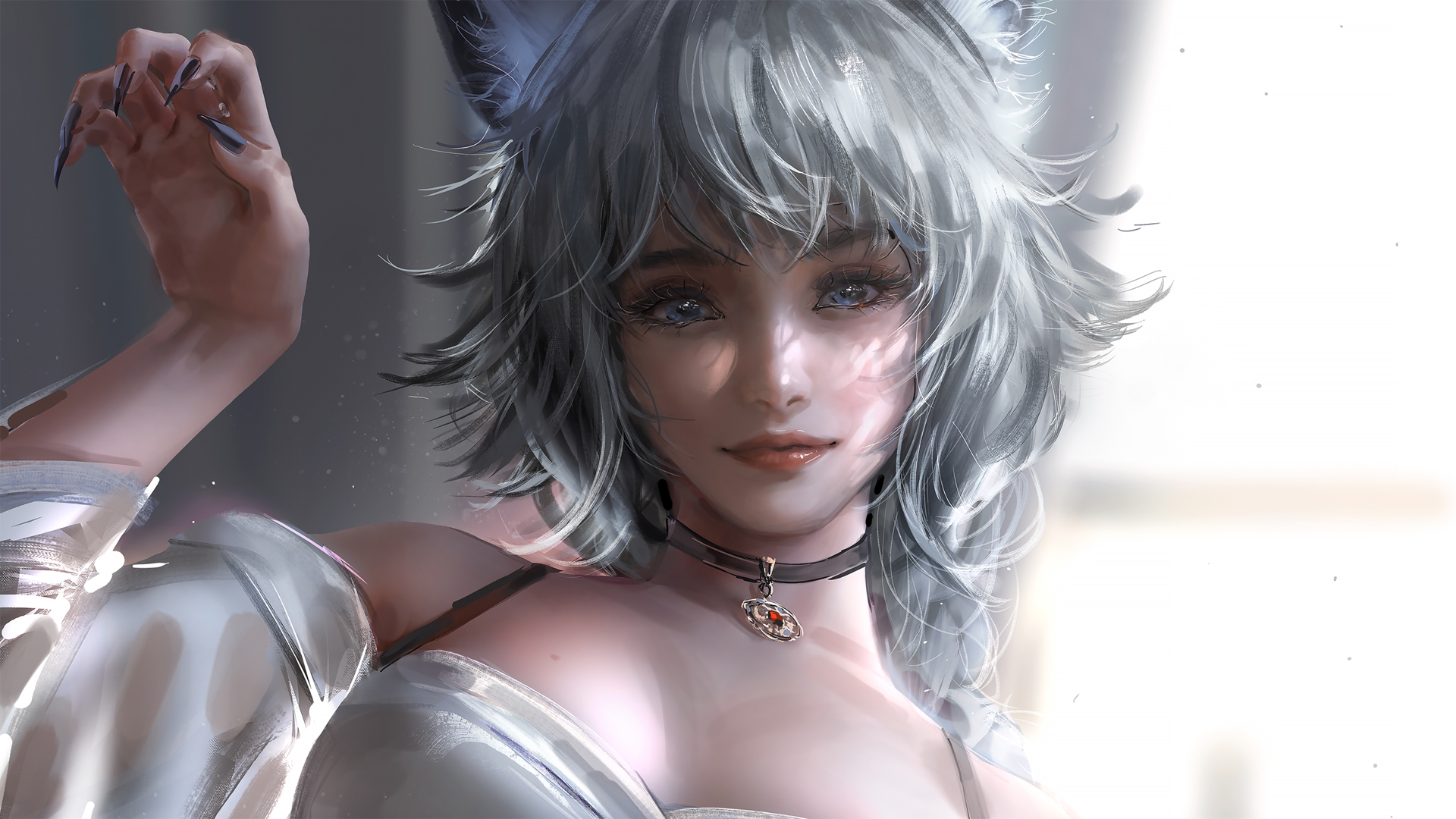 女孩心情猫耳朵尾巴清酒看风景动漫免费电脑壁纸下载