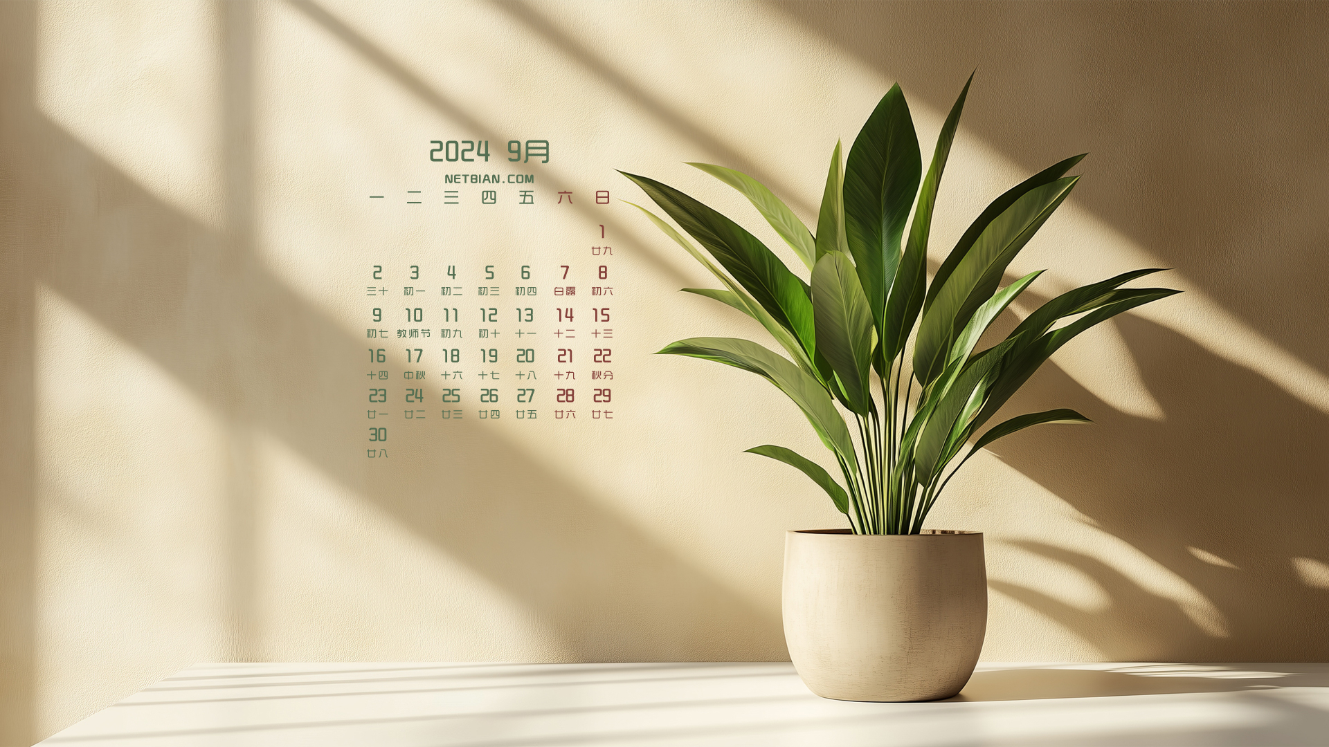 蓝色水面2024年9月电脑桌面日历壁纸