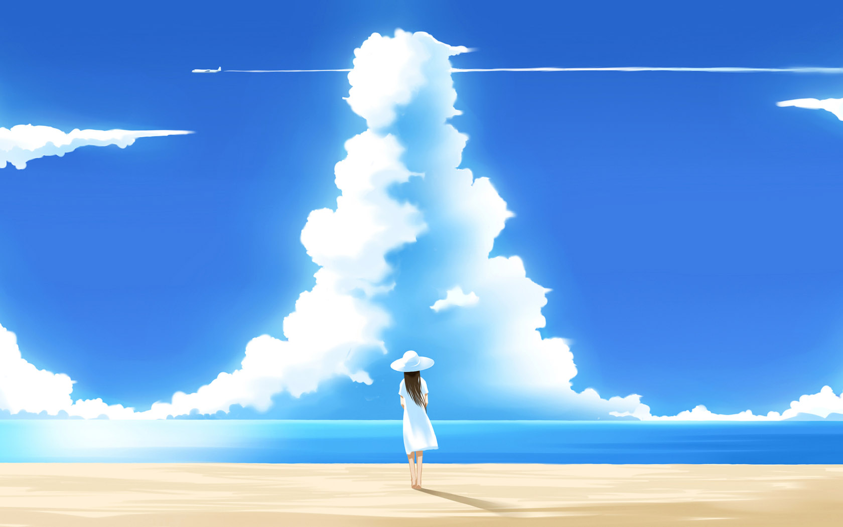 清新动漫壁纸免费下载,房间少女蓝色眼睛配夏天裙子与室内绿植