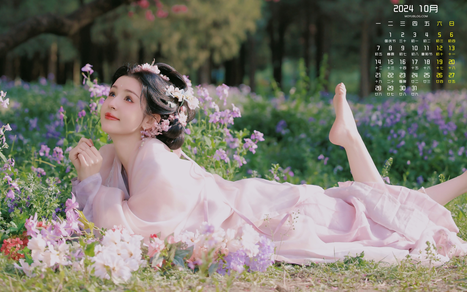 2024年10月草地鲜花美女风景日历免费电脑壁纸下载