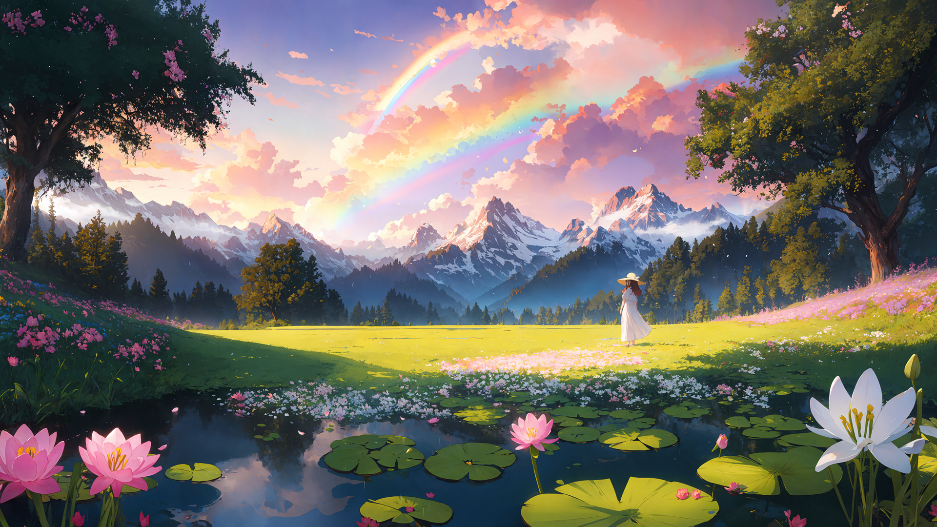 小女孩与荷花花草树木构成的美丽风景免费电脑壁纸下载
