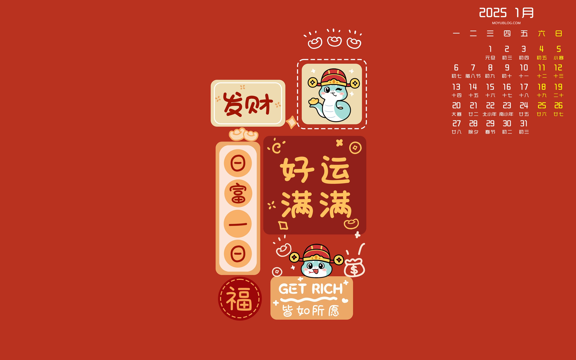 招财进宝2025年2月日历电脑桌面壁纸