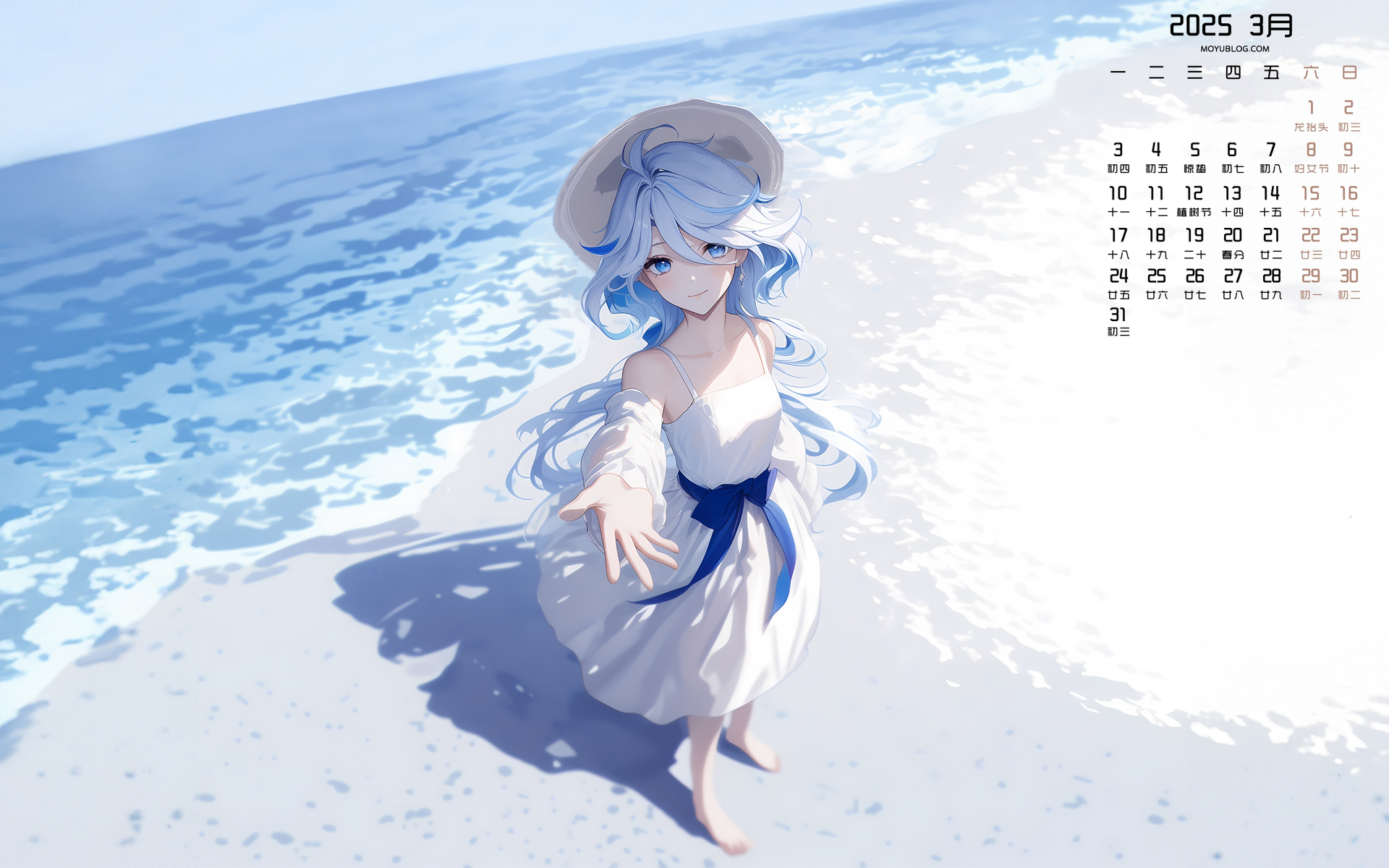 蓝色水面2024年8月日历桌面壁纸高清风景