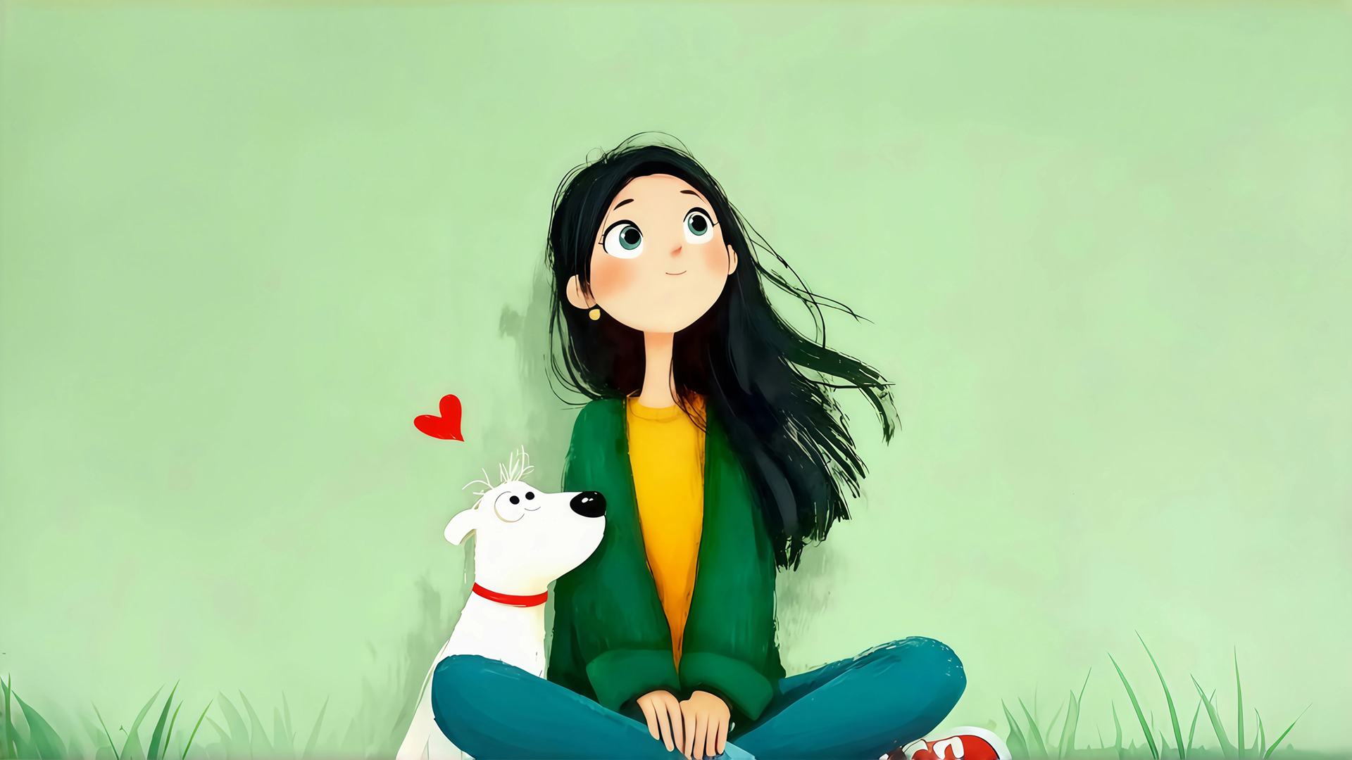 治愈系女生与小狗浅绿色背景动漫电脑壁纸免费下载