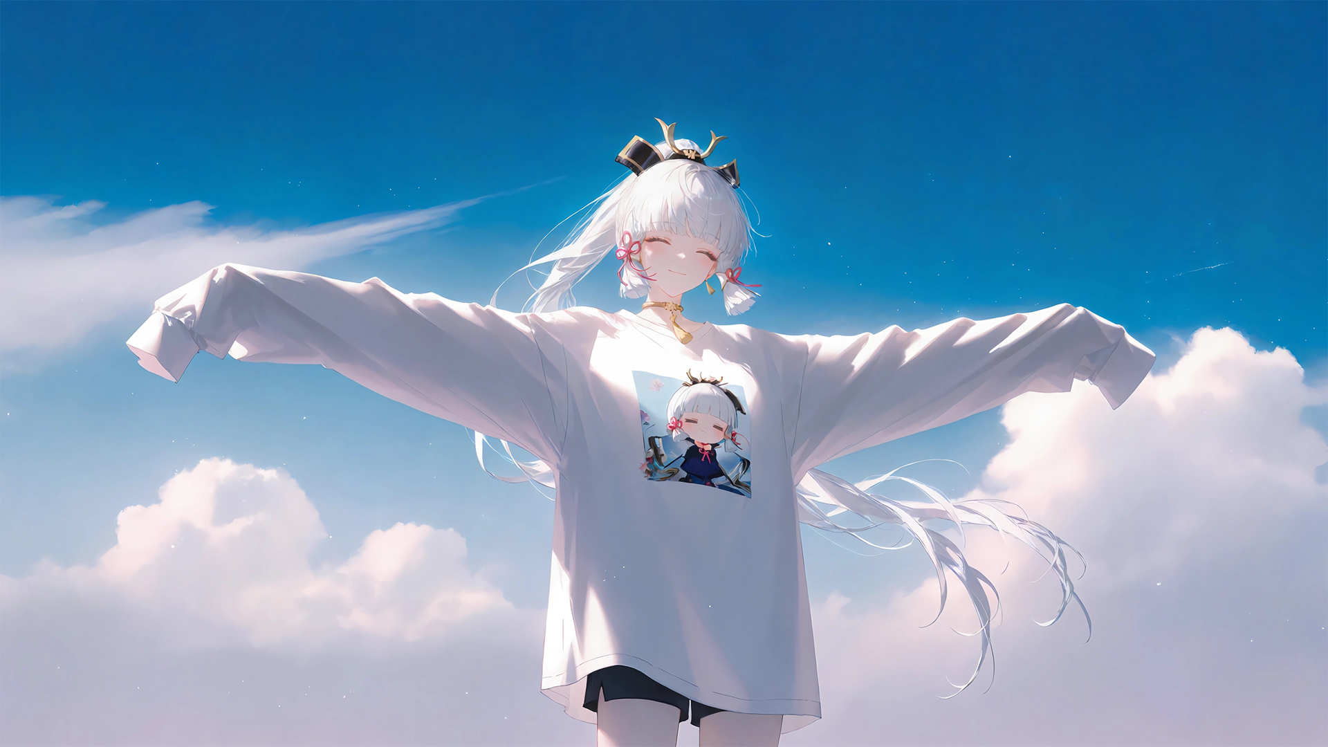 《原神》神里绫华蓝天白云白T恤动漫免费电脑桌面壁纸下载