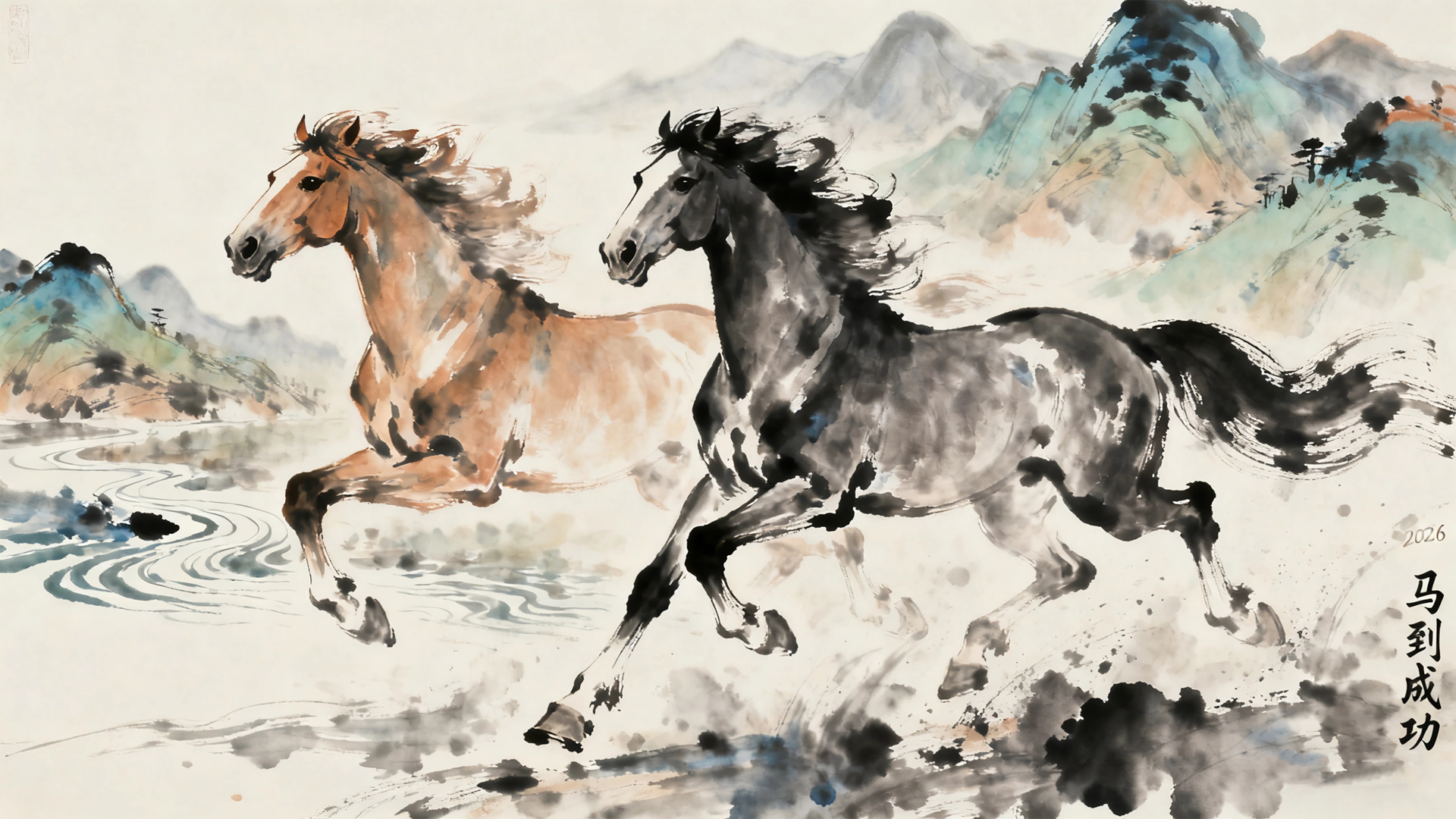 2026马到成功 两匹骏马 马年水墨画桌面壁纸