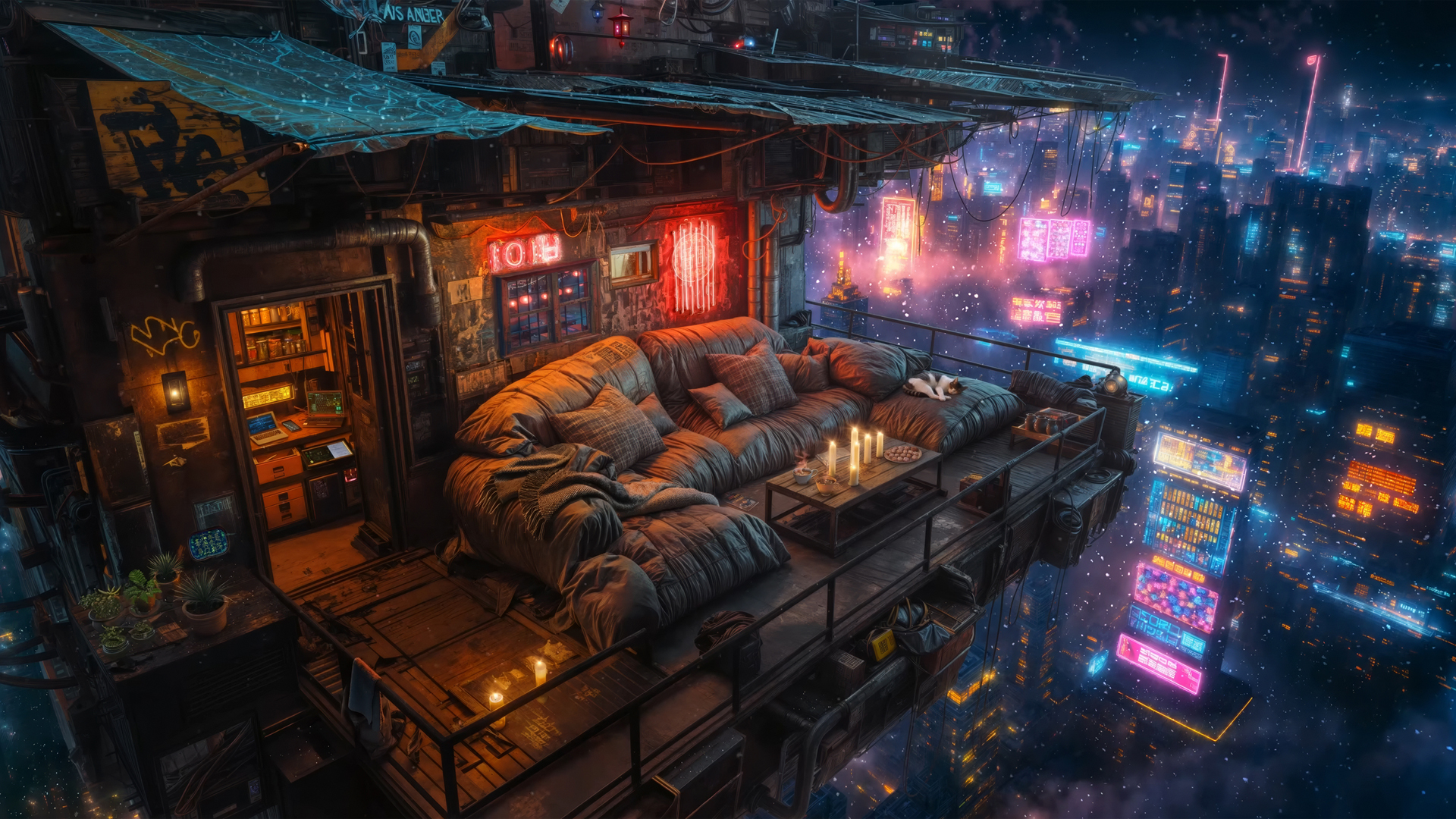 房间中床边听音乐女孩与笔记本电脑 好看厚涂动漫壁纸免费下载