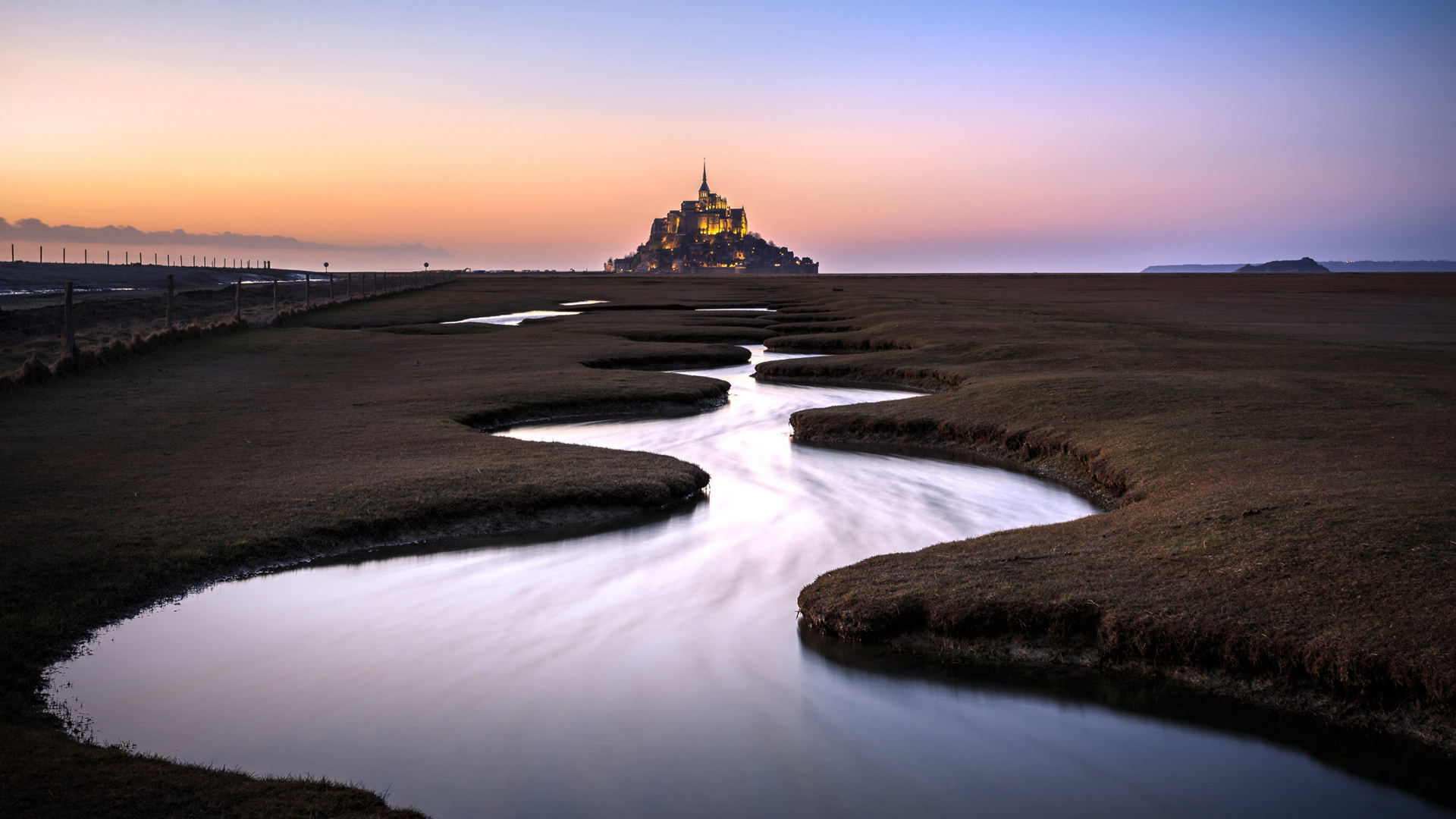挪威小屋栅栏山湖风景 免费电脑桌面壁纸下载 天空云与太阳光线美景