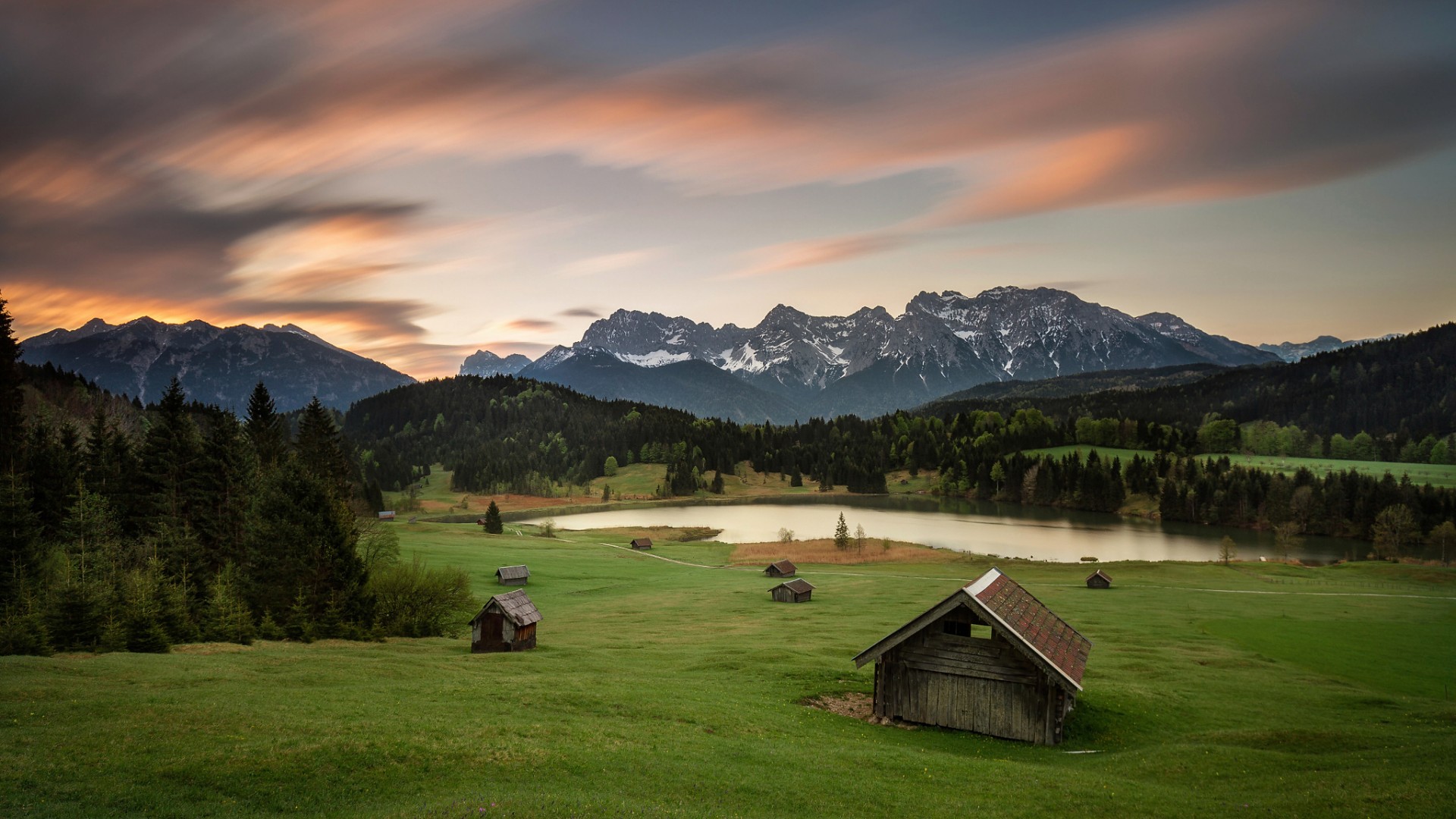 山下房子树林与宁静湖水风景免费电脑壁纸下载