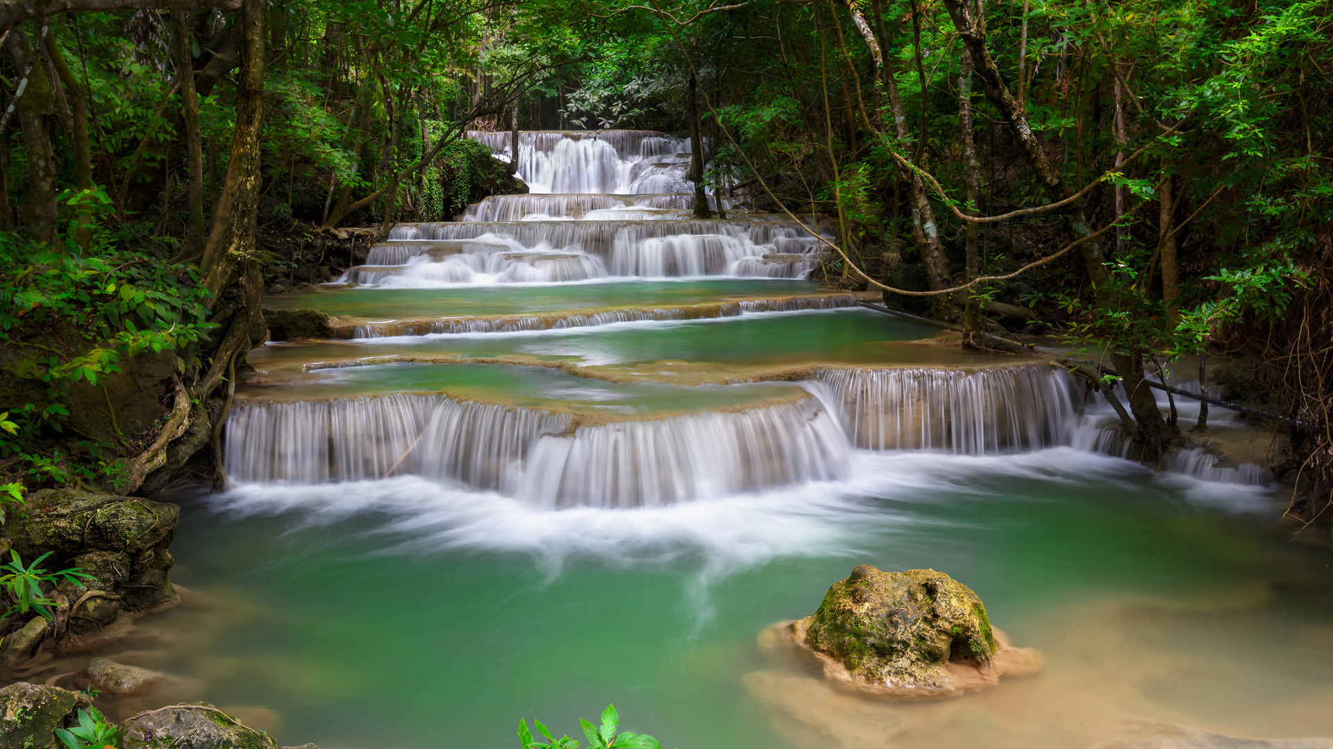 森林树木瀑布河流绿色自然风景免费电脑壁纸下载