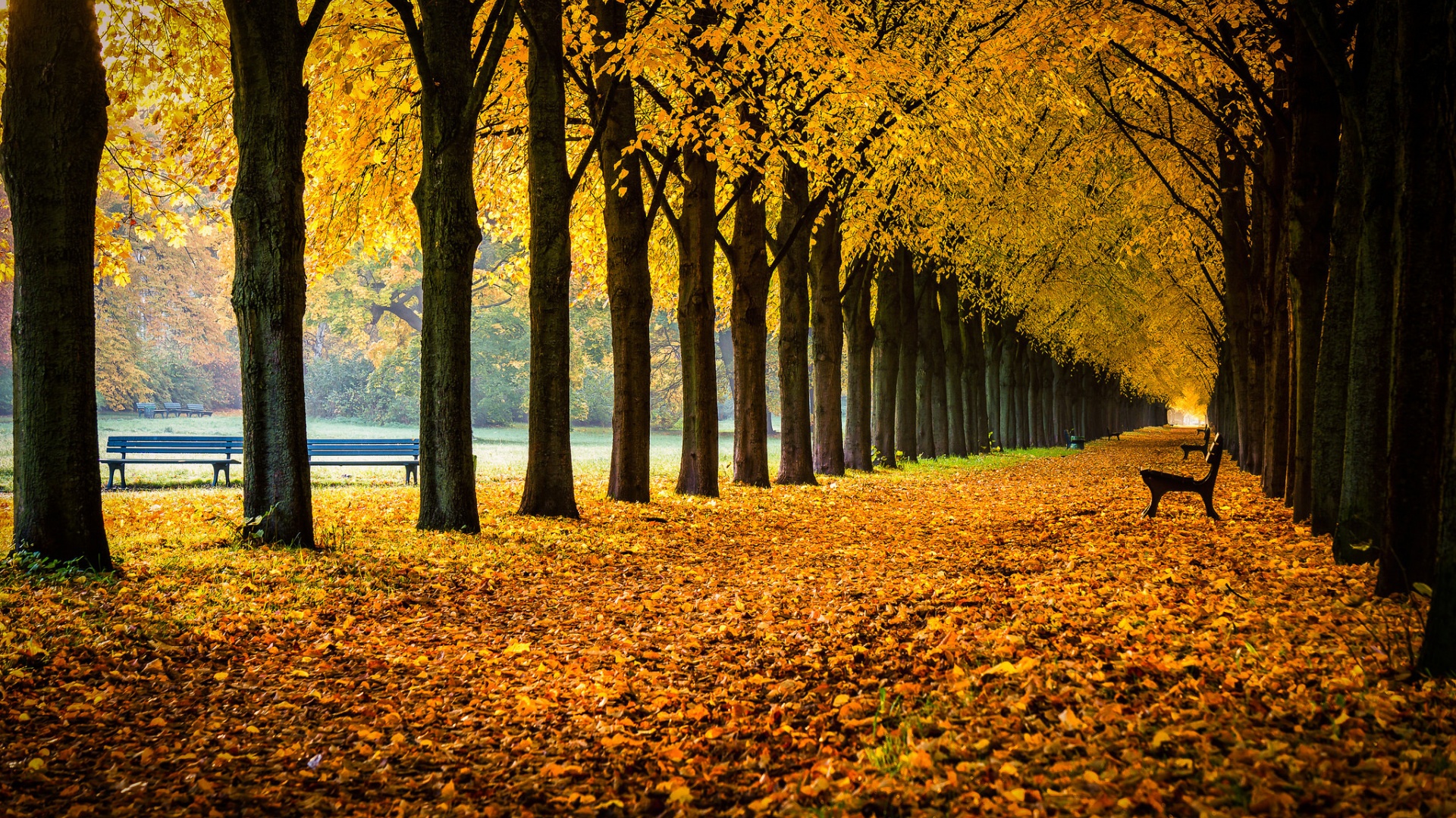秋天树叶与栅栏篱笆栏杆构成的唯美风景电脑壁纸免费下载