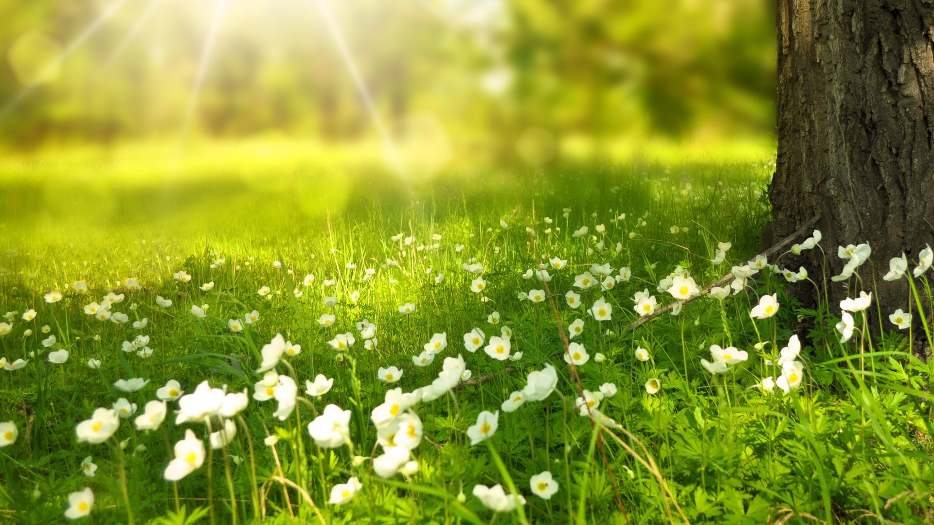 绿色自然风景桌面壁纸免费下载,树绿叶草坪与天空美景电脑壁纸