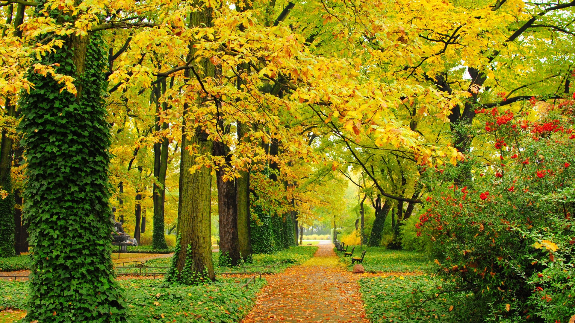 秋天公园森林多彩风景 河水小桥树叶小路电脑壁纸免费下载